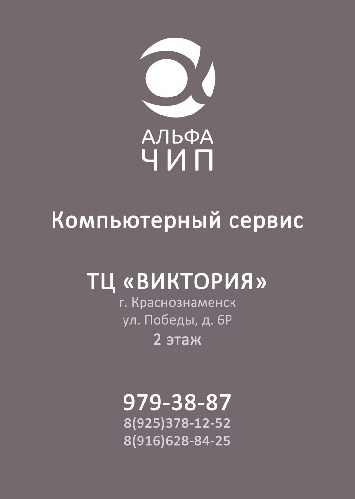 Альфа ЧИП - это сервисный центр широкого профиля, предоставляющий услуги населению в сфере информационных технологий. У нас производятся всеразличные манипуляции по ремонту и модернизации Ваших железных ящичков ЭВМ, при поломке которых, как правило, жизненный цикл замедляется, пульс учащается, работа останавливается... Помимо этого у нас присутствует профессиональный фотограф, который может воплотить ваши фантазии и мечты в виде прекрасных снимков! Так же, если Вы увлекаетесь какими либо хобби для народа, имеете свою фирму, или просто хотите заявить о себе более обширно, то и тут мы сможем помочь, разработав для Вас сайт по Вашим пожеланиям и нуждам!