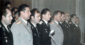 На фотографии, запечатлевшей встречу руководства Центра КИК и его ведущих подразделений с космонавтом Ляховым В.А., представлены (слева направо) в первом ряду: генерал-майоры Пшеничный И.В. (замполит начальника центра управления), Иванов В.Н. (начальник штаба), генерал-лейтенант Шлыков Н.Ф. (начальник КИК), полковники Ляхов В.А. (космонавт) и Кузнецов И.Г. (зам по политчасти), генерал-майор Тамкович Г.М. (зам по испытаниям и научной работе). Во втором ряду - капитан 1-го ранга Балабай И.А., генерал-майор Саус В.А. (зам по связи), полковники Альхов В.Ф. (замполит начальника баллистического управления), Барабано-в Н.М. (начальник баллистического управления), Дохов М.Т. (начальник центра управления). Петухов А.Н., Терешин М.И. (начальник управления).
