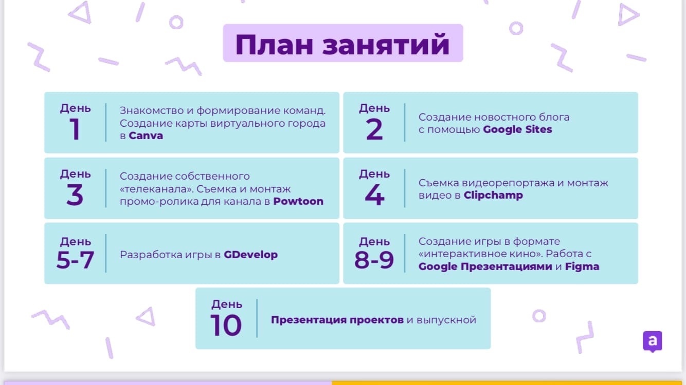 Летние смены — это 10 дней работы над креативными digital-проектами: съемки видео, профессиональный монтаж, ведение новостного блога, создание игр и проработка 3D-персонажей.