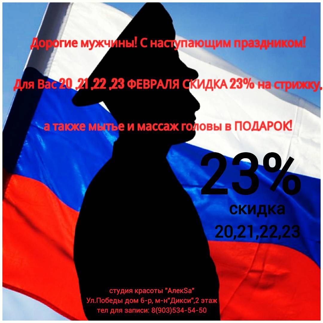 Дорогие мужчины! Студия красоты "АлекSa" поздравляет Вас с наступающим праздником и дарит вам акцию! Приходите к нам 20,21,22 и 23 февраля и получите СКИДКУ 23% + мытье и массаж головы в ПОДАРОК!