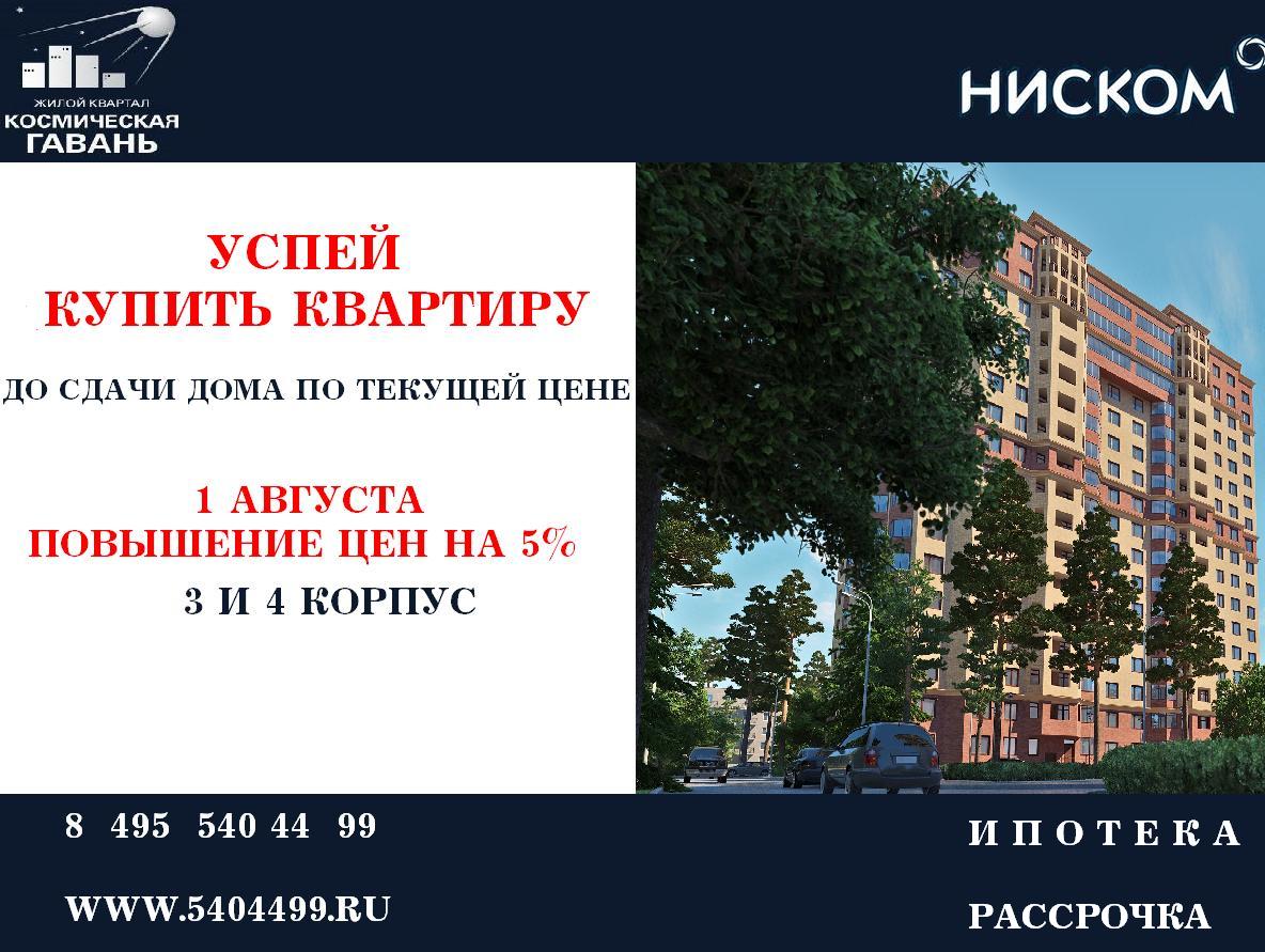 С 1 августа 2016г рост цен на квартиры в 3 и 4 корпусе ЖК «Космическая Гавань» составит 5%. Успейте купить квартиру по текущей цене! Скоро новоселье!
