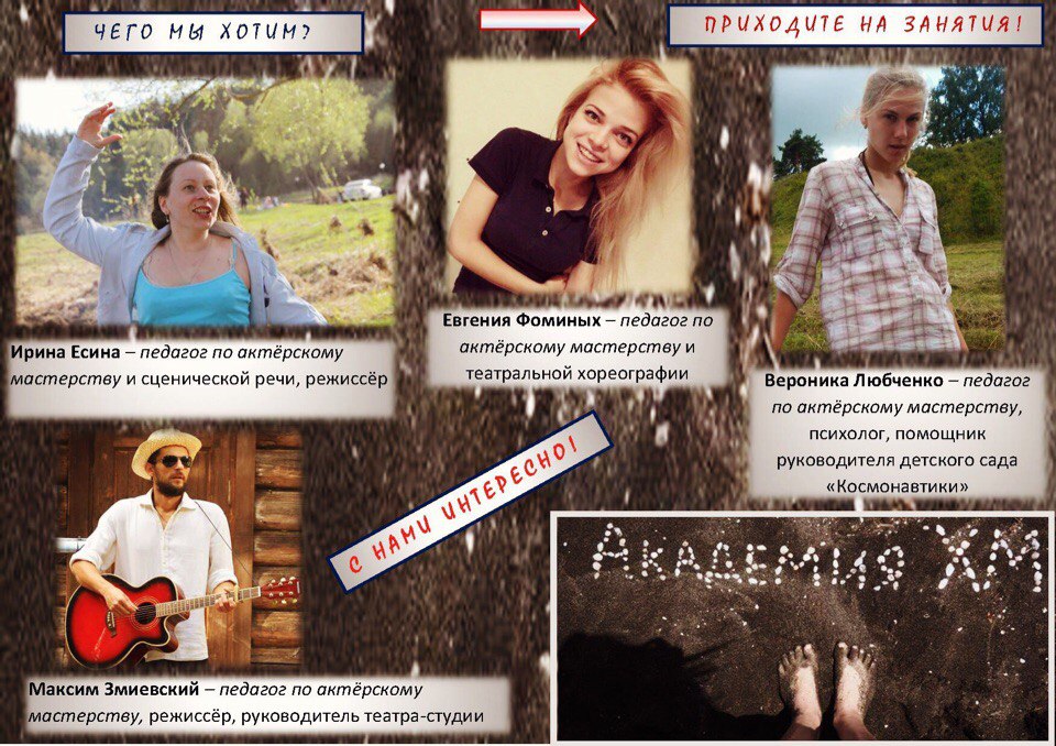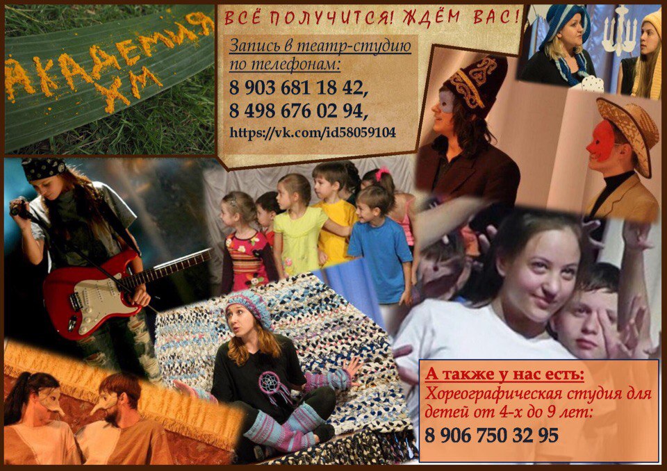 Попробовать играть в театре-студии "Академия ХМ!" имеет право каждый! Записывайтесь на занятия по указанным телефонам, или в "личных сообщениях" руководителю театра-студии. P.S. А пока вы думаете, мы расскажем вам, что вот уже два года мы взаимодействуем с Детским музеем (http://www.childrens-museum.ru). Регулярно проводим различные мастер-классы с приглашёнными специалистами (например, цикл потрясающих трёхчасовых мастер-классов по фехтованию в марте- апреле 2016 года с педагогом РАТИ (ГИТИС) Дмитрием Александровичем Ивановым, или августовская игра об А.С. Пушкине, прошедшая в родовом имении А.С. Пушкина и соседних усадьбах под руководством удивительного педагога и человека, Александры Борисовны Никитиной, в результате которой участники за неделю выпустили два самых настоящих журнала). И много-много ещё всего завораживающего и интересного! Звоните! Мы вас ждём! Мы в вас верим! Всё получится!