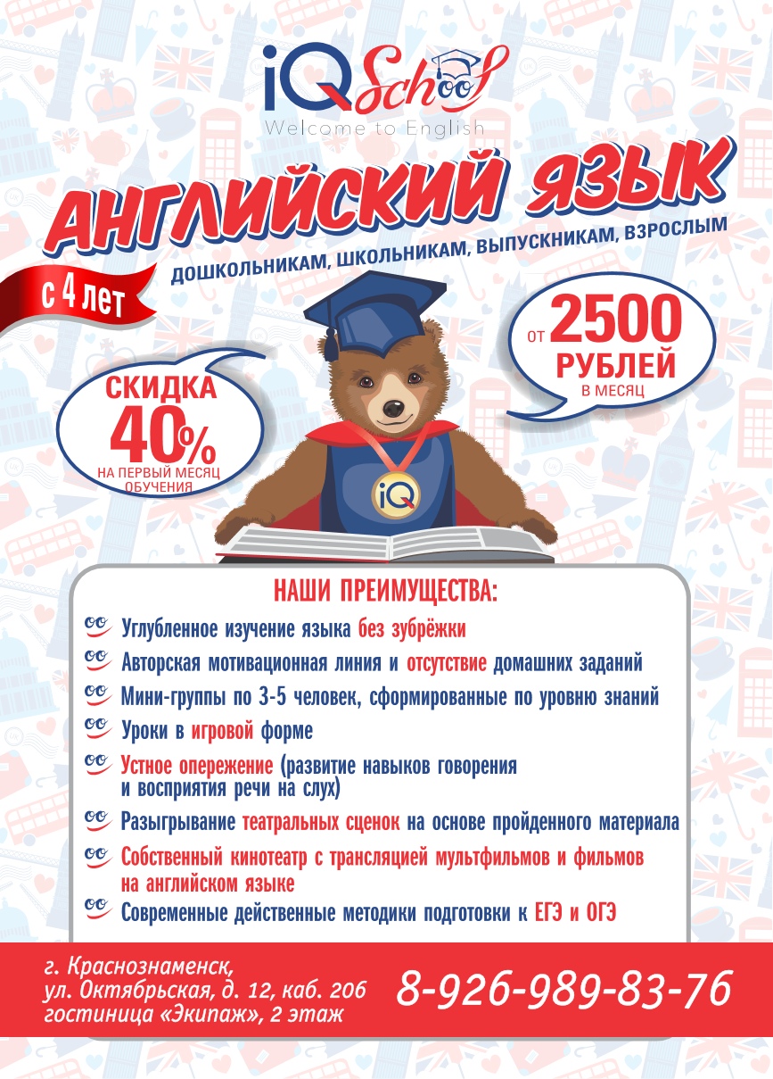 Студия английского языка “iQ-School” в городе КРАСНОЗНАМЕНСК объявляет набор учеников на новый учебный год!