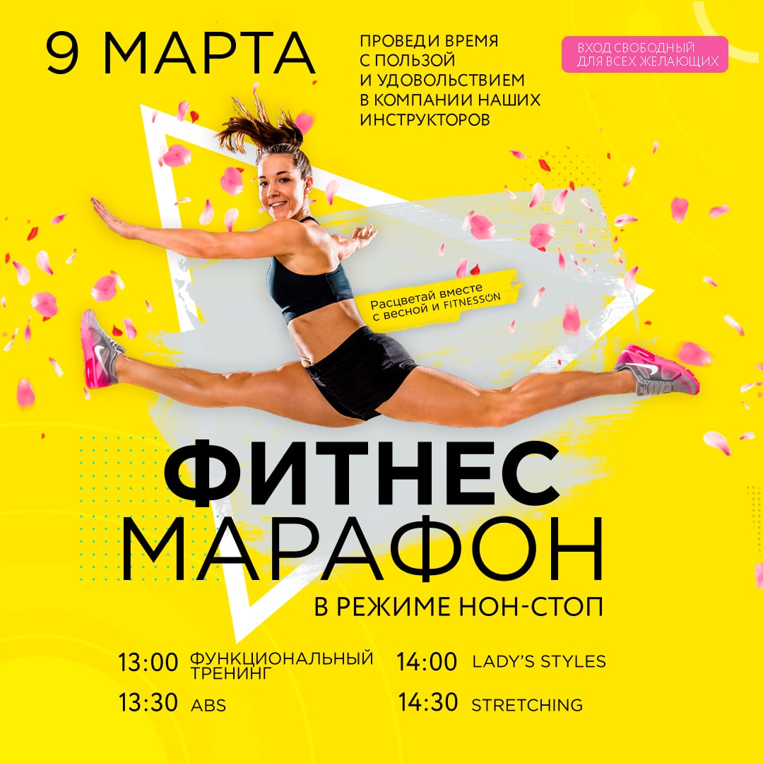 И в честь праздника 9 марта мы устраиваем фитнес марафон для ВСЕХ ЖЕЛАЮЩИХ, где наши замечательные групповые инструкторы создадут праздничное настроение и зарядят Вас энергией.