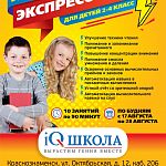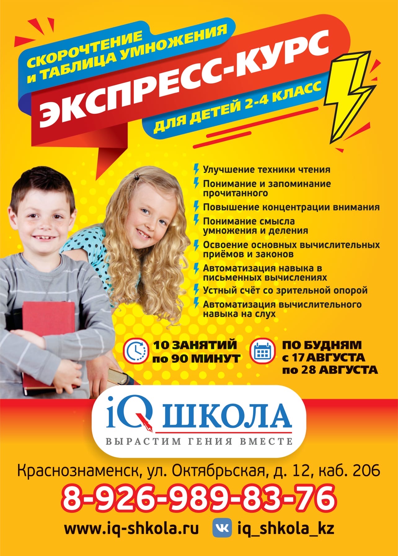 «iQ-школа» () приглашает учеников 2-4 классов на экспресс-курс «Скорочтение и таблица умножения», который будет проходить с 17го по 28е августа.