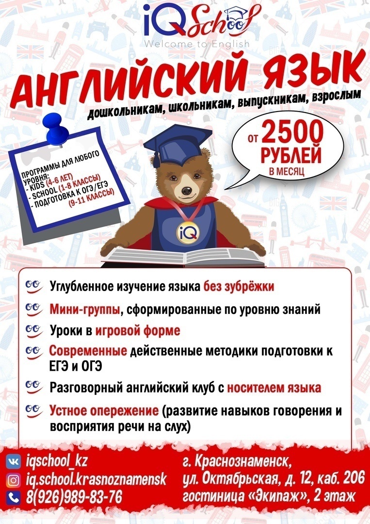 Студия английского языка “iQ-School” в городе КРАСНОЗНАМЕНСК приглашает на БЕСПЛАТНЫЕ пробные занятия с 28 августа.