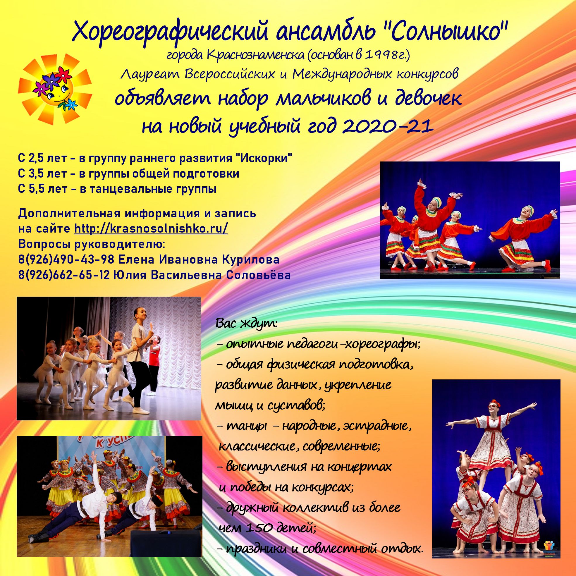 Хореографический ансамбль "Солнышко" города Краснознаменска, неоднократный лауреат Всероссийских и Международных конкурсов ведет набор мальчиков и девочек на новый 2020-2021 учебный год.