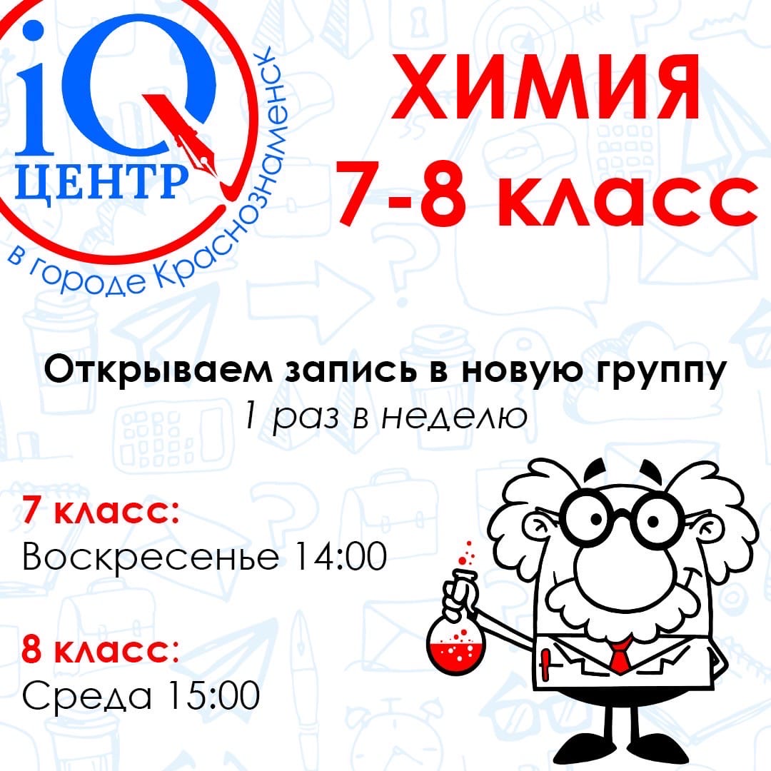 «iQ-центр» (https://vk.com/iq_centr_kz ) приглашает учащихся 7 и 8 классов на занятия по химии.