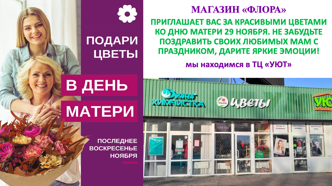 Ждём вас в этот праздничный день в нашем магазине «ФЛОРА». Порадуем вас приятными ценами и индивидуальным подходом к каждому клиенту!