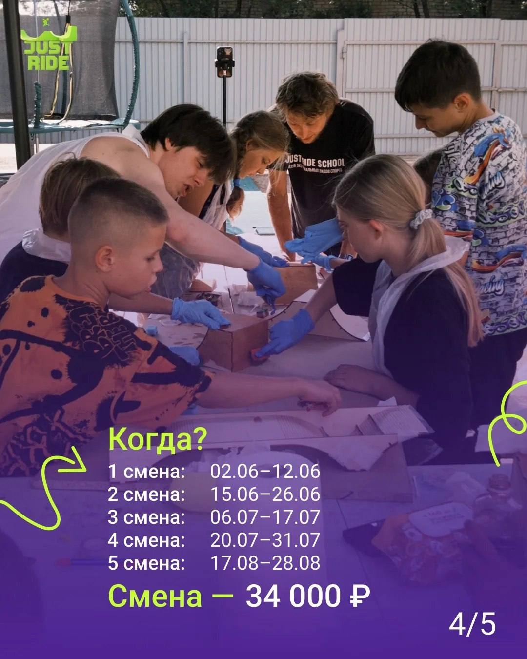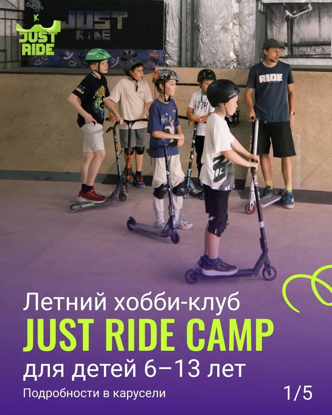 Идет набор в летний городской хобби-клуб Just Ride для детей 6–13 лет. Смены лета 2026: 02.06–12.06, 15.06–26.06, 06.07–17.07, 20.07–31.07, 17.08–28.08.