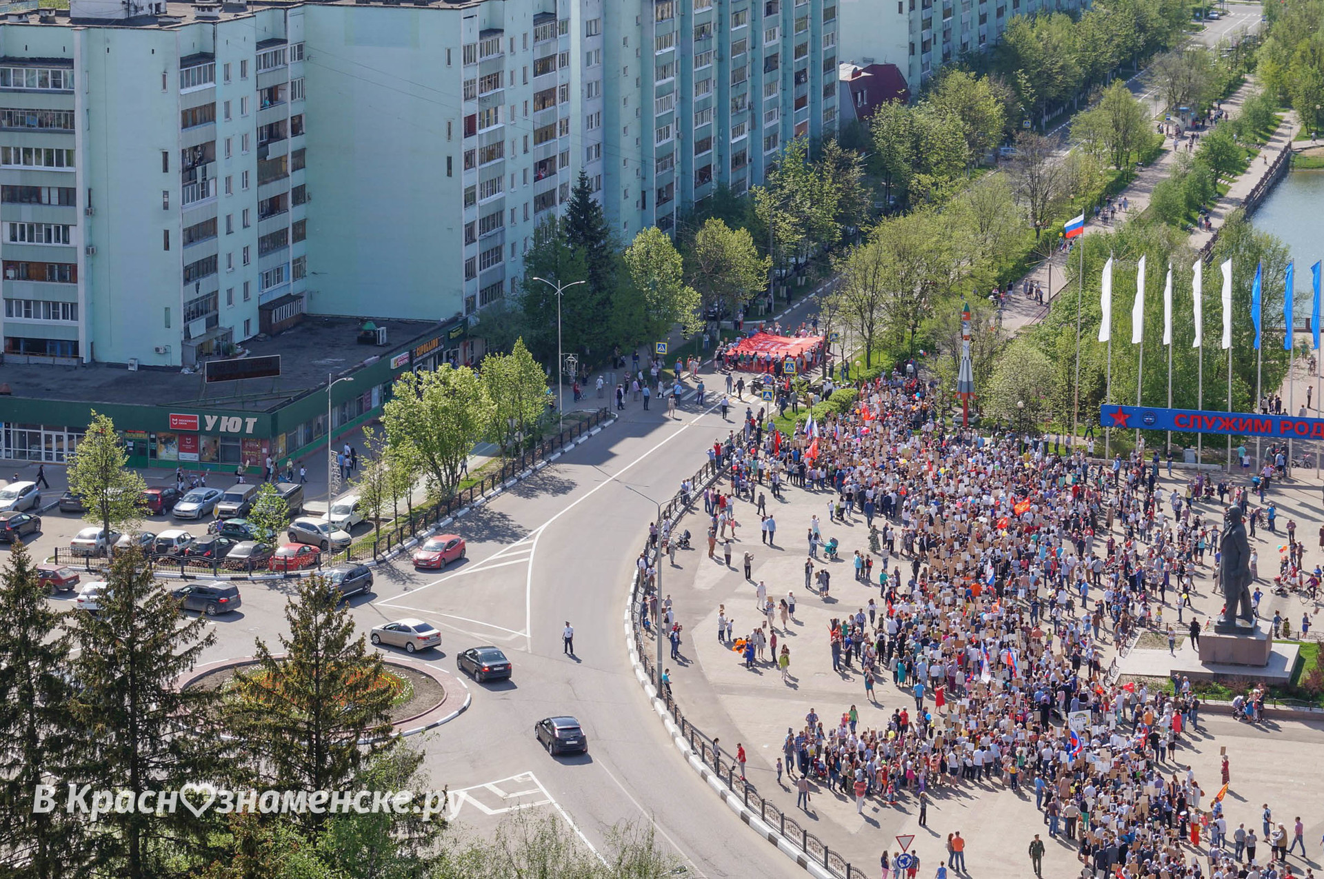 Около Сквера Победы участники шествия замедлят шаг в знак глубокого уважения к Подвигу Советского народа в годы войны и послевоенное время.