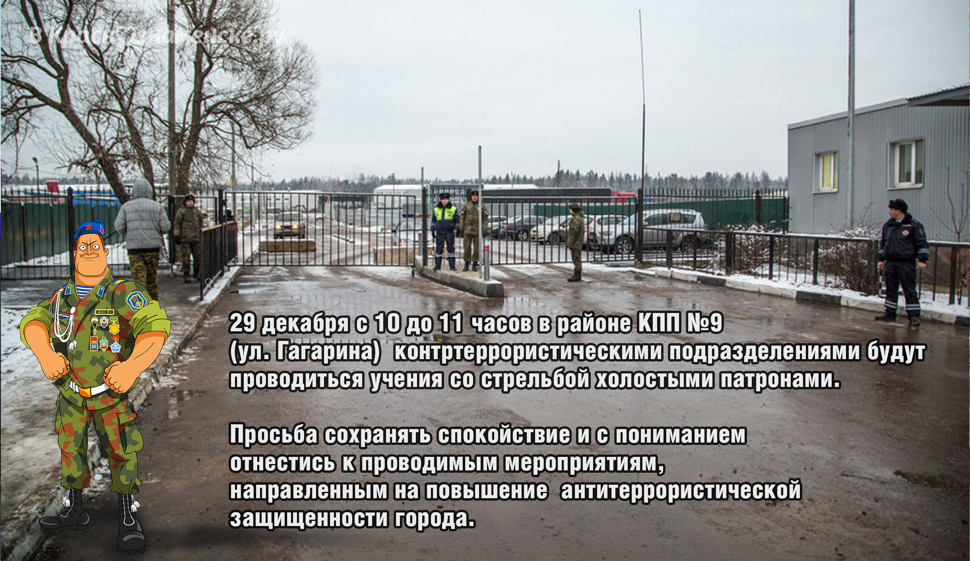 29 декабря с 10 до 11 часов в районе КПП №9 (ул. Гагарина) контртеррористическими подразделениями будут проводиться учения со стрельбой холостыми патронами.