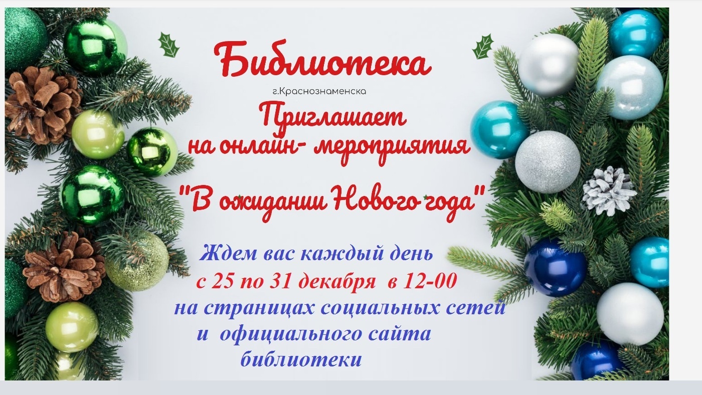 В преддверии Нового года Центральная муниципальная библиотека г. Краснознаменска подготовила праздничную программу онлайн-мероприятий. В последнюю неделю уходящего года на официальном сайте библиотеки и на страницах социальных сетей вам будут представлены мероприятия и мастер-классы.