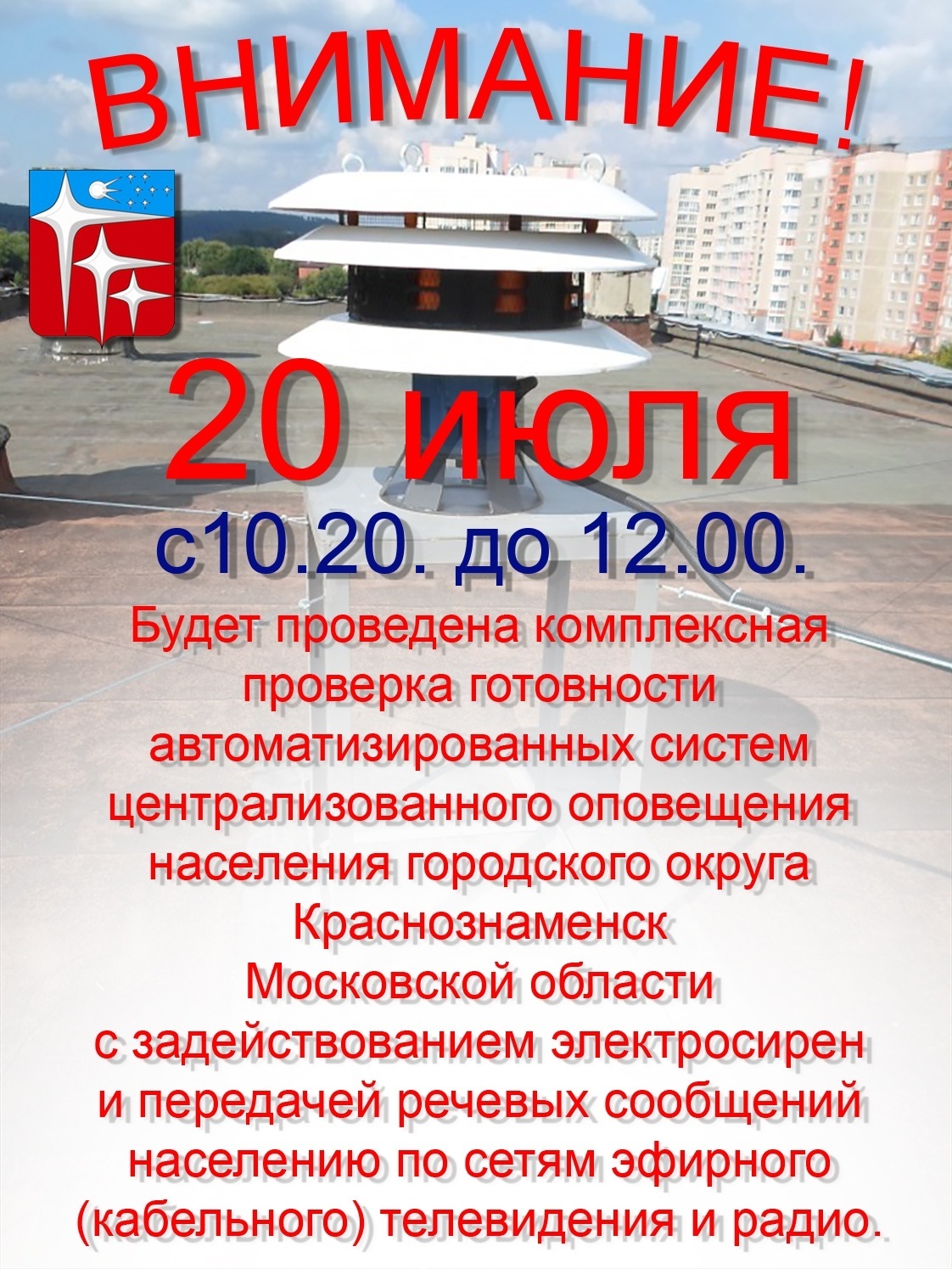 Уважаемые жители Краснознаменска! 20 июля будет проводиться плановая комплексная проверка готовности региональной автоматизированной системы централизованного оповещения.