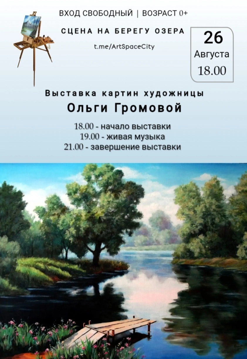 26 августа с 18.00 на малой сцене начнётся выставка картин художницы из Краснознаменска - Ольги Громовой. С 19.00 будет звучать живая музыка. 21.00 - завершение выставки.