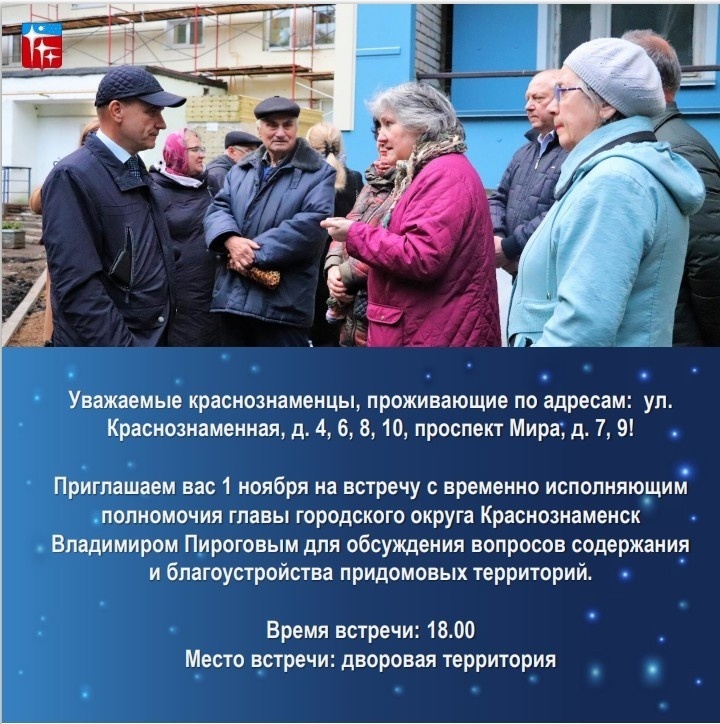 Встреча ВРИП главы Краснознаменска Владимира Пирогова с жителями проживающими по адресам: ул. Краснознаменная, д. 4, 6, 8, 10, проспект Мира, д. 7, 9