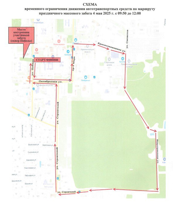 Во время проведения марафона с 09.50 до 12.00 будут перекрываться следующие улицы города: ул. Победы, ул. Октябрьская, пр. Мира, ул. Краснознаменная, ул. Связистов, ул. Индустриальная, ул. Строителей. Просим заранее выбирать альтернативные маршруты.