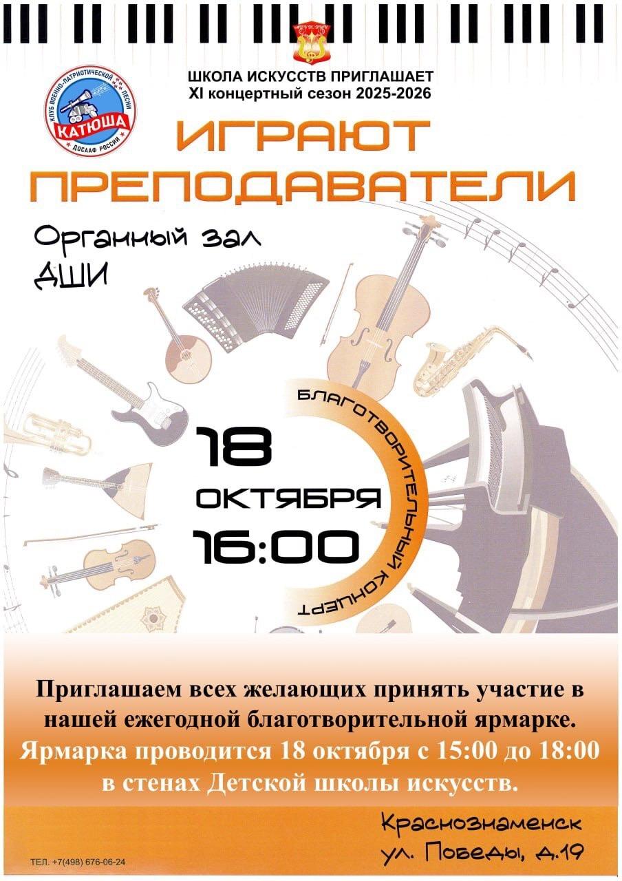 Приглашаем всех желающих принять участие в нашей ежегодной благотворительной ярмарке. Ярмарка пройдет 18 октября с 15:00 до 18:00 в стенах Детской школы искусств. В 16:00 состоится благотворительный концерт "Играют преподаватели" в Органном зале ДШИ.