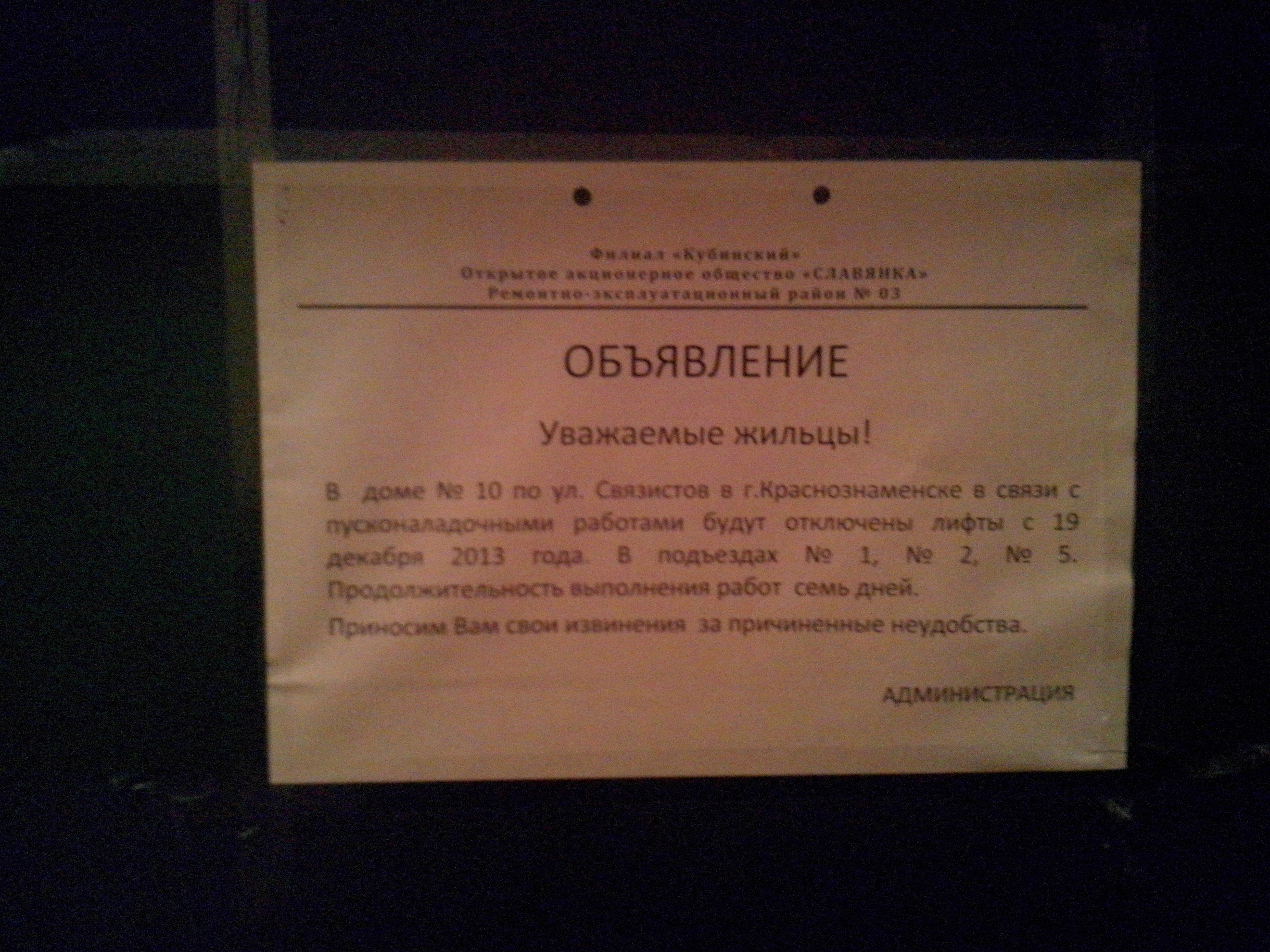 Управляющая компания ОАО "Славянка", разместила объявления в доме № 10 по улице Связистов об отключении лифтов в 17-ти этажных домах в связи "с проведением пусконаладочных работ" сроком "на семь дней"!