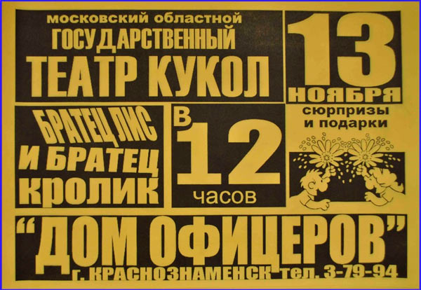 13 ноября в 12:00 в Доме офицеров состоится детский спектакль Московского областного государственного театра кукол "Братец Лис и братец Кролик"