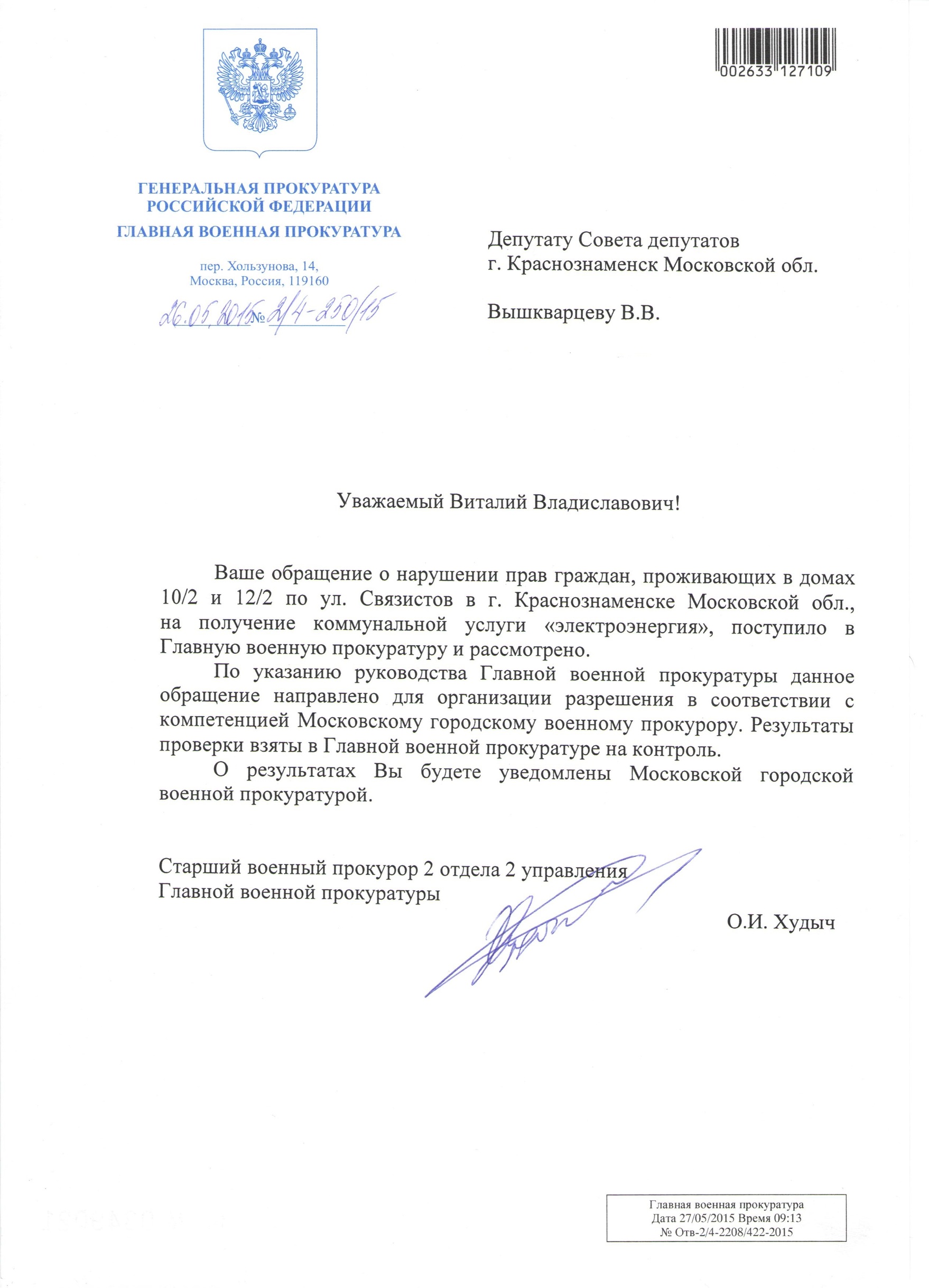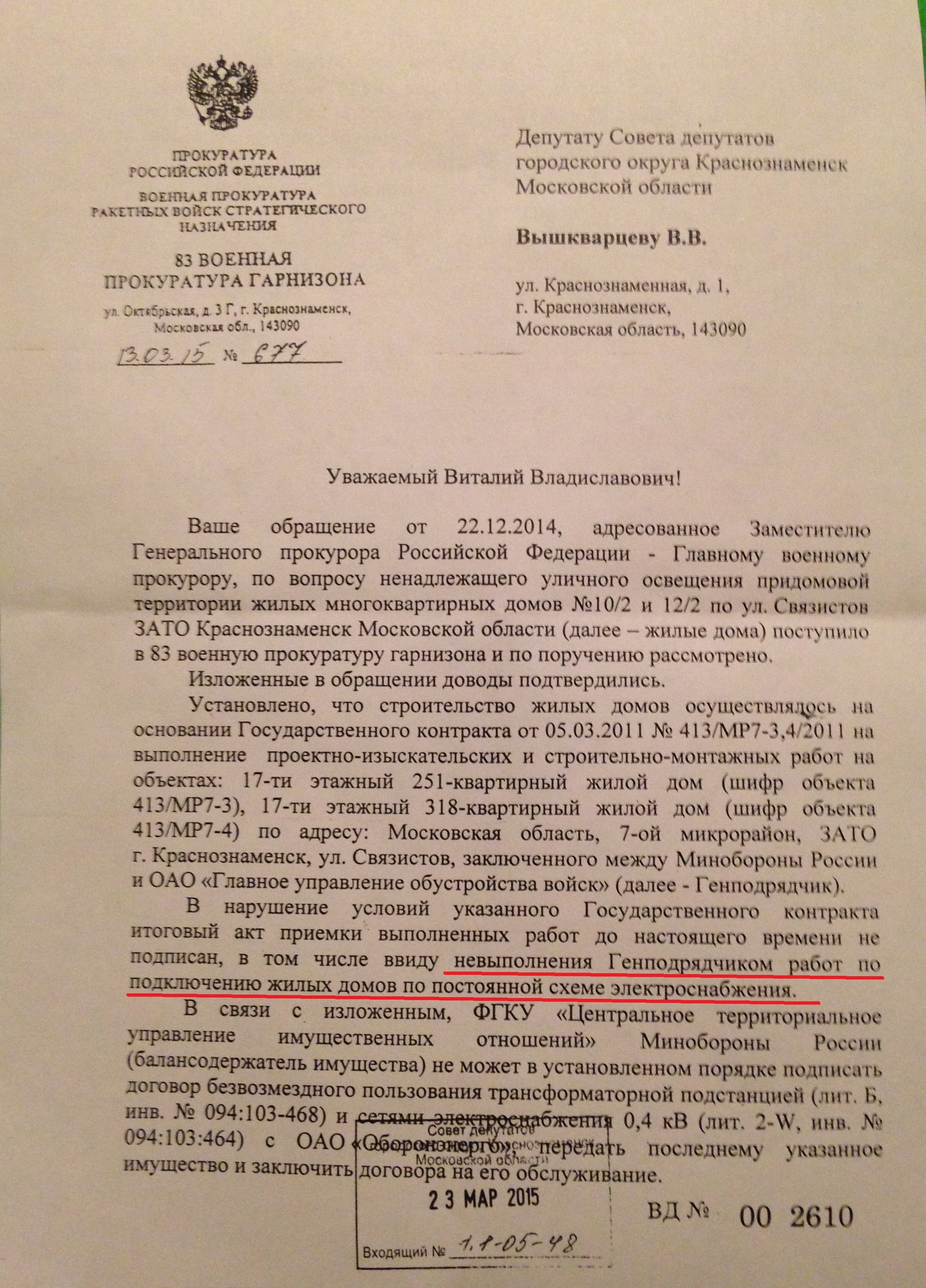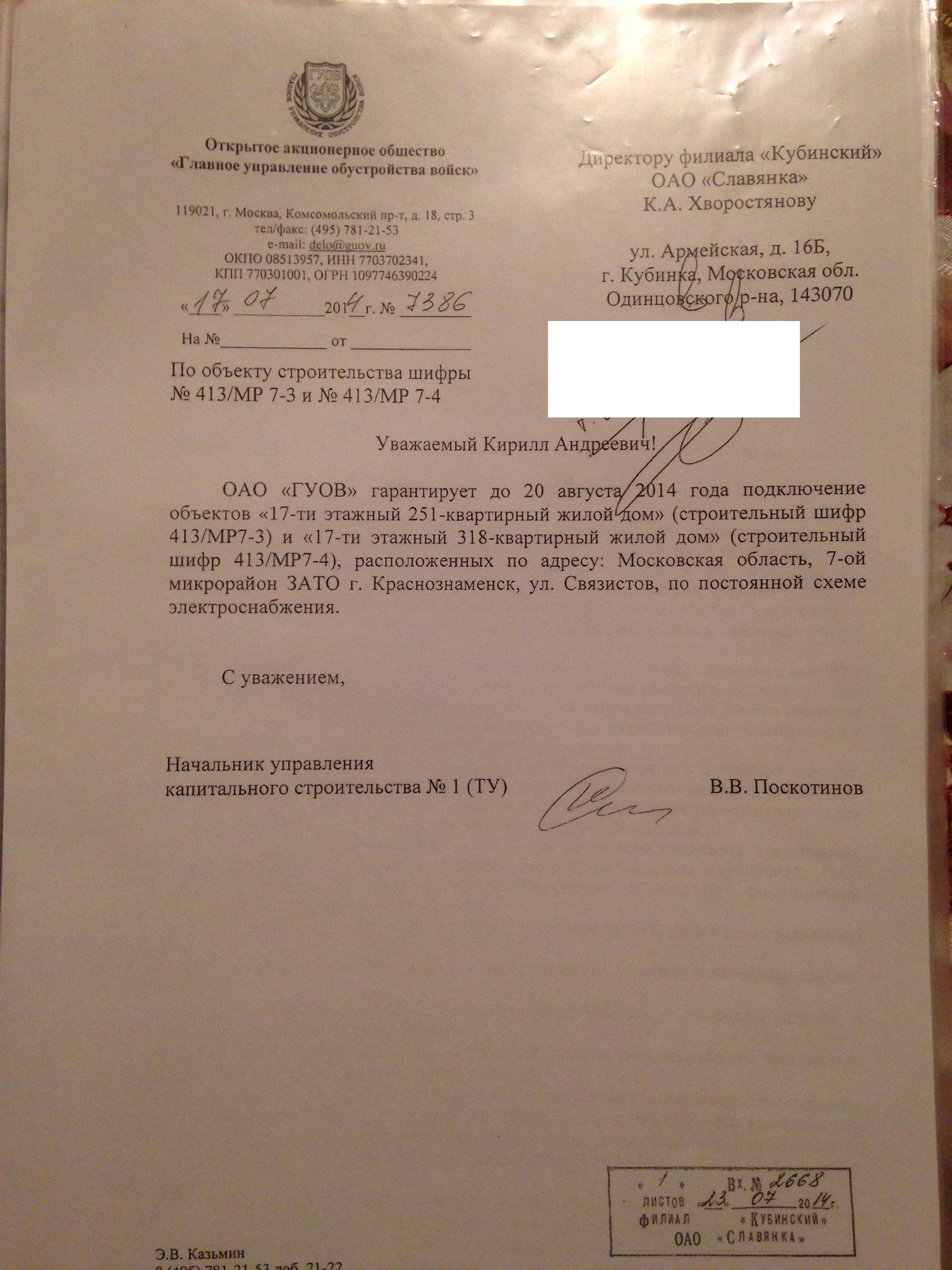 Напомним, что 10 мая около 4 часов утра новые дома в мкр. Связистов (10/2 и 12/2) оказались обесточены. В итоге заложниками аварии на энергосетях стали жители двух домов. Лишь благодаря совместным действиям и усилиям городских служб (энергетики от Министерства обороны не смогли оперативно помочь людям) электроснабжение удалось восстановить и около 10.50 11 мая жители домов, смогли вернуться к обычному ритму жизни. Разумеется, после случившегося необходимо было сделать выводы: резервного питания (прим. автора: с 19 мая оборонэнерго запустило вторую (резервную) высоковольтную э/линию) нет, дома не подключены по постоянной схеме энергоснабжения. Причем согласно соответствующему постановлению Правительства России запрещается подключение по «времянке» домов, которые введены в эксплуатацию. Спустя некоторое время, мы собрались с жителями домов и подписали коллективную жалобу. 159 человек поставили свои подписи, чтобы достучаться в Министерство обороны и обратить внимание на эти вопиющие события. Нужно сказать, что недавно мы обращались в Военную прокуратуру по вопросу ненадлежащей работы наружного уличного освещения. В начале этого года прокурор Эдуард Анатольевич Роженко, хотя и аккуратно, обратил внимание, что дома не подключены по постоянной схеме. К нам в руки попал уникальный документ – письмо ОАО «Главное управление обустройства войск» (ОАО «ГУОВ»), которое выступило гарантом подключения домов по «постоянке» до 20 августа 2014 (!!!) года и является ОТВЕТСТВЕННЫМ лицом. Это письмо было направлено Директору филиала «Кубинский» ОАО «Славянка» К.А. Хворостьянову. В письме по определенным соображениям заретушированы некоторые фамилии. Судя по всему, это тоже сотрудники местного подразделения Славянки, которые также владели этой информацией. Мне известно, что Глава города Михаил Васильевич Сапунов также недавно выступил в поддержку жителей, сделав обращение в Военную Прокуратуру и получил ответ, что ОАО «ГУОВ» выдано предписание об устранении нарушений закона и предложено в кратчайшие сроки обеспечить постоянное энергоснабжение домов по соответствующим э/сетям. О чем это говорит? О том, что мы не должны беспокоиться по этому вопросу, поскольку ОАО «ГУОВ», как структурой, учрежденной Минобороны, были даны (что на редкость) гарантии проведения таких работ, причем этим гарантиям предшествовали всевозможные совещания и обсуждения со стороны всех заинтересованных лиц. Это очень серьезная и трудоемкая работа, которая должна была закрыть эту проблему. В итоге, так уж повелось, проблема осталась, а жители снова пострадали. Следовательно, пришлось вновь подключать контрольно-надзорные органы, выводить людей на улицу, ходить по квартирам и собирать подписи. В настоящее время переданные нами документы находятся в работе прокуратуры, а всем нам осталось ждать положительных изменений в пользу жителей.