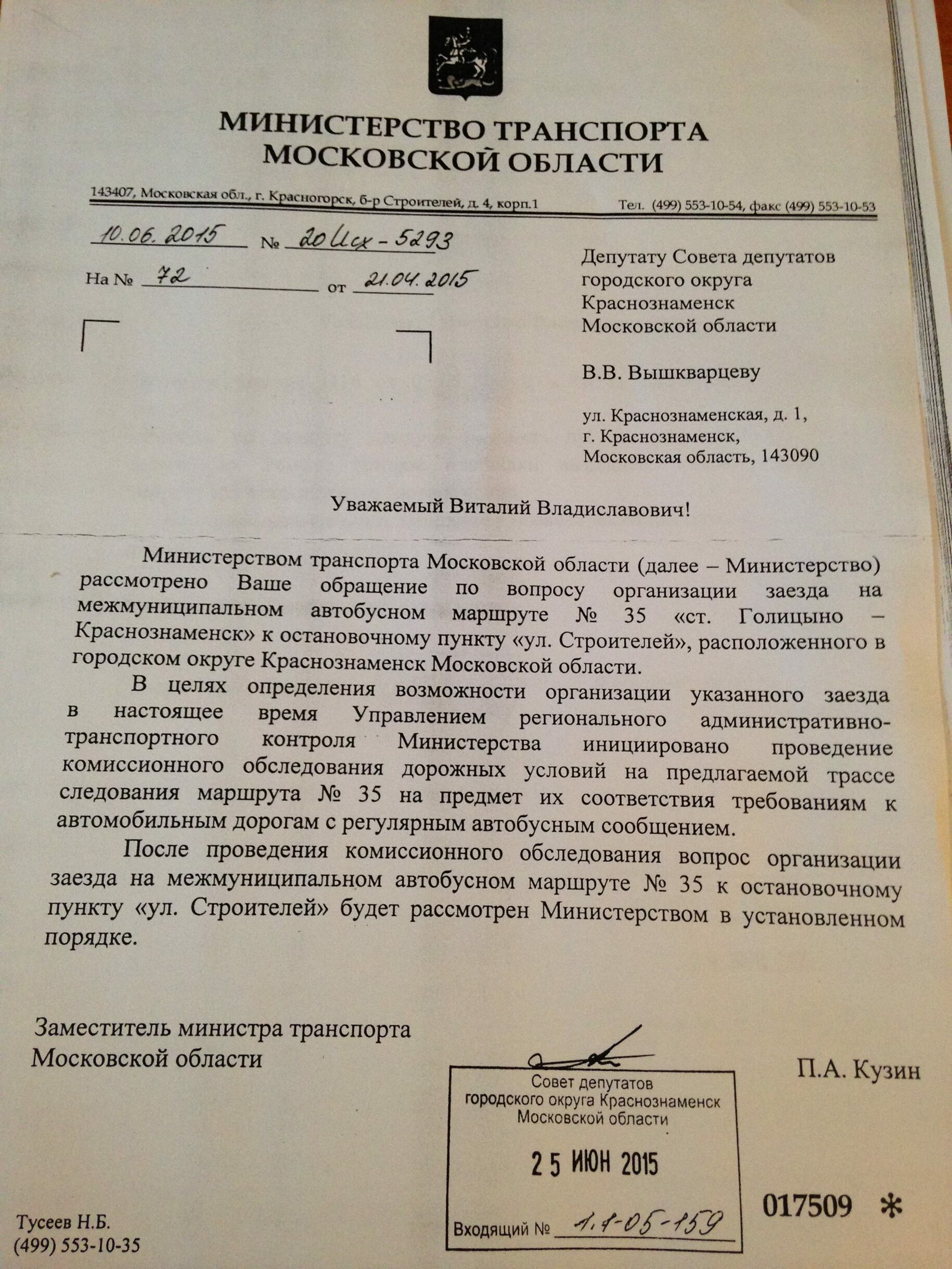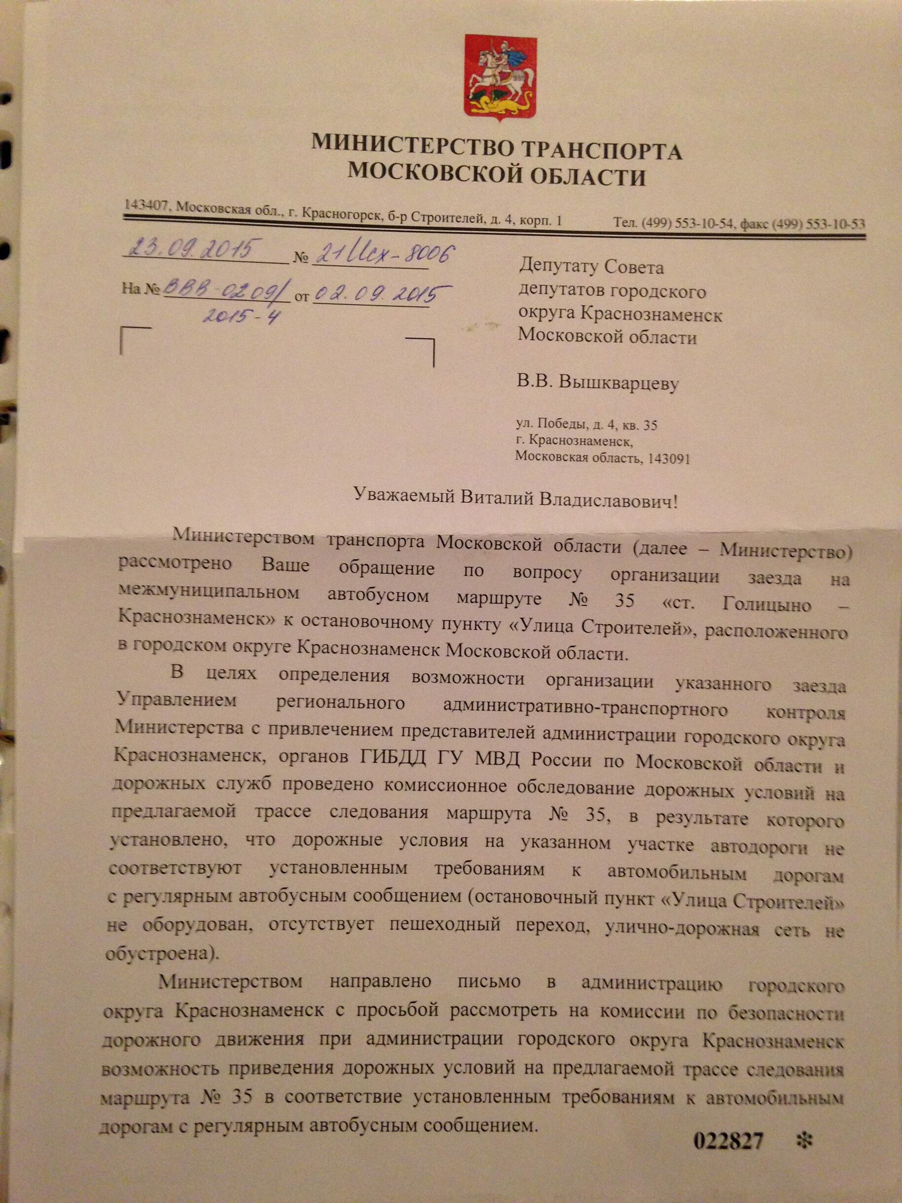 Получил ответ Минтранса Московской области по вопросу организации прямого автобусного сообщения Краснознаменск-Лесной городок. Думаю каждому понятно, что сегодня очень актуален вопрос "выхода" на станции МЦД-4 и Краснознаменску необходимо развивать новые транспортные артерии