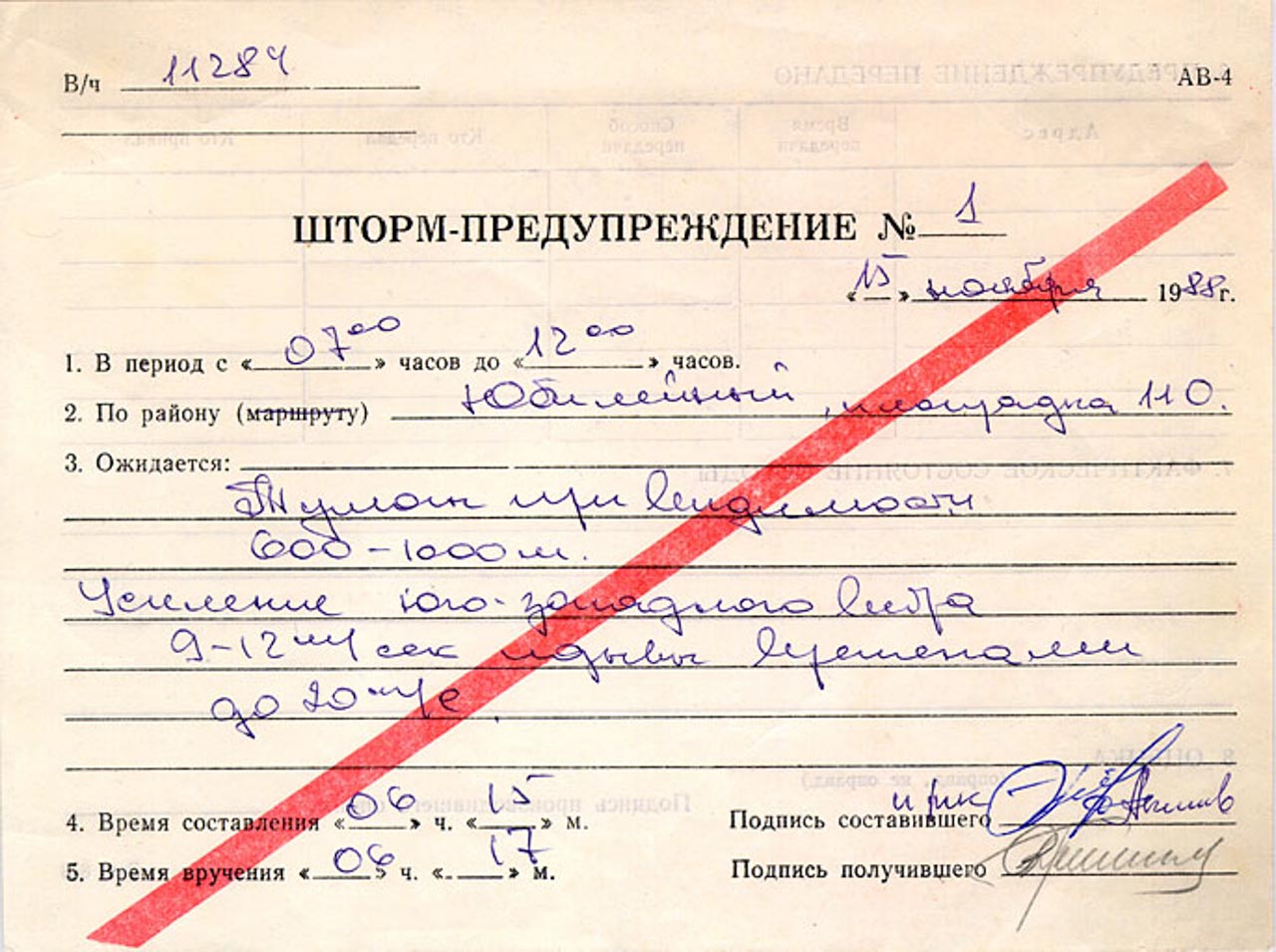 За 30 минут до запуска командиру боевого расчета по пуску "Энергии-Бурана" В.Е.Гудилину под роспись вручают штормовое предупреждение: "Туман при видимости 600-1000 м. Усиление юго-западного ветра 9-12 м/сек, порывы временами до 20 м/сек". Но после короткого совещания, изменив направление посадки "Бурана" (20º против ветра), руководство принимает решение: "Пускать!". До пуска 26 минут - на "Буране" включились бортовые радиоответчики системы "Вымпел-К". Корабль готовился к пуску.