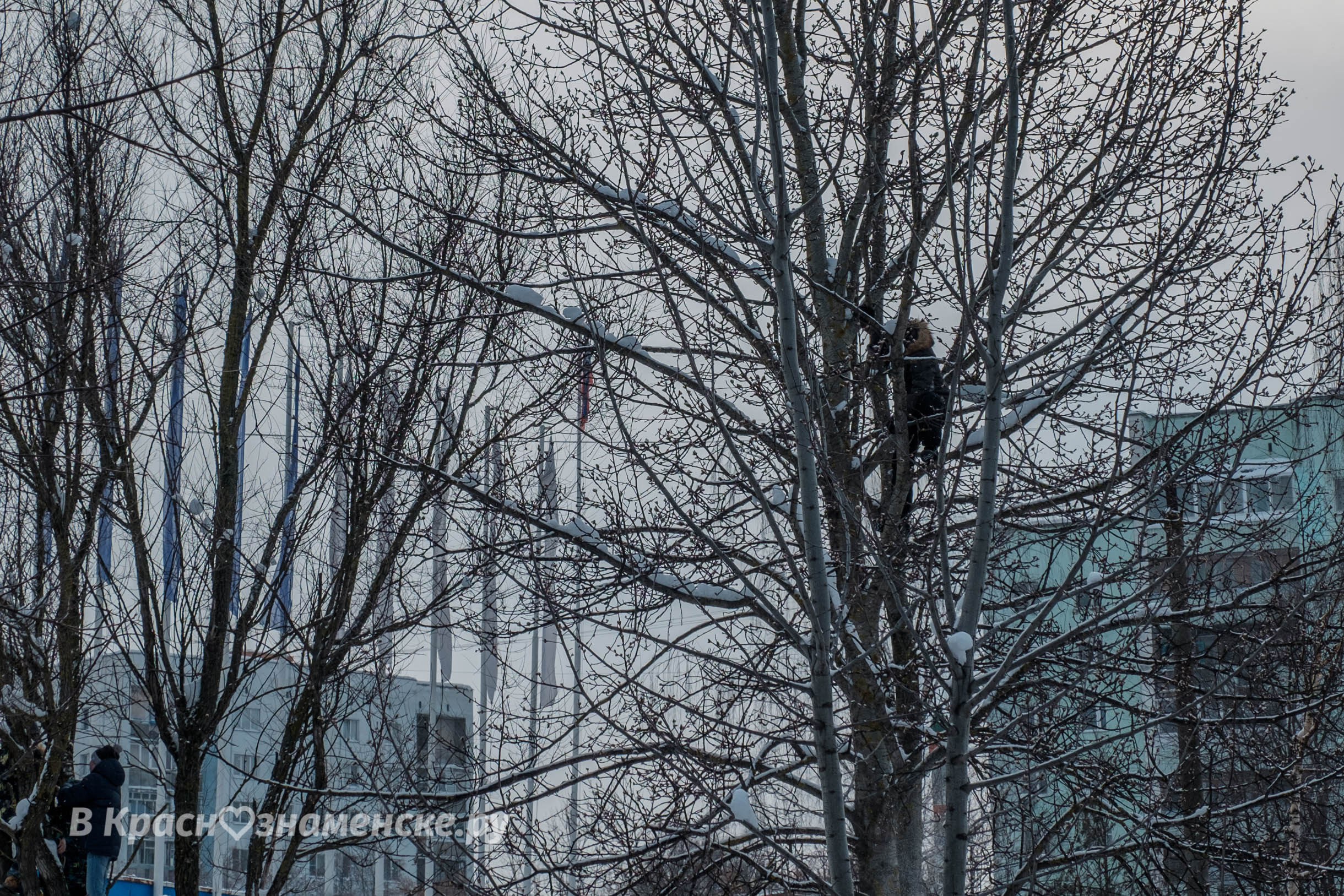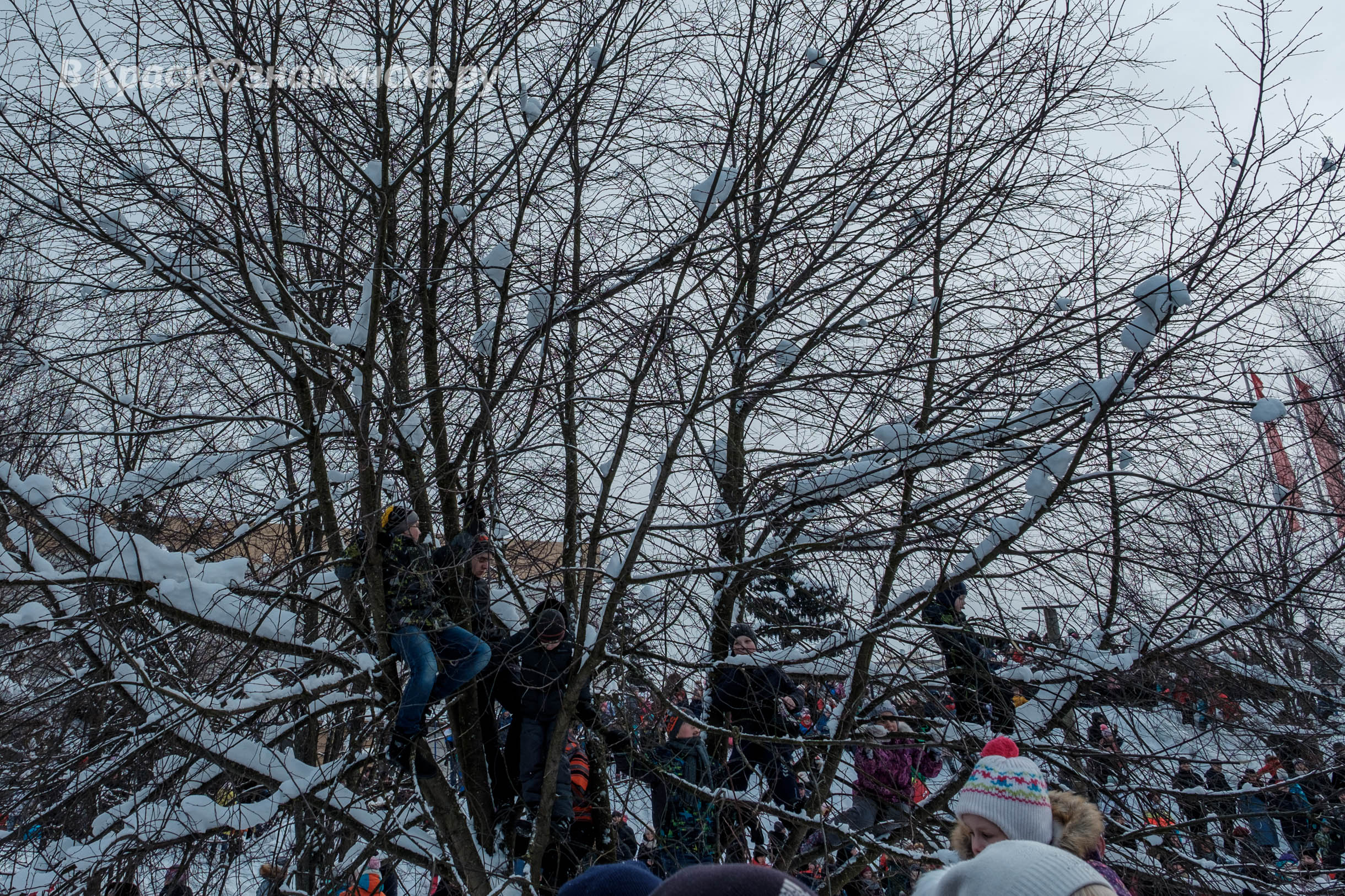 В 12:05 толпа зароптала, "кого ждём ?", "спички дать ?" , не уверенно полетели первые снежки в организаторов, дети полезли на деревья. В 12:10 ловко прилетел снежок в голову начальнику отдела культуры. Он грозит пальцем, толпа гогочет, матери причитают "ноги мёрзнут!", организаторы нервно куда-то звонят, детишки добрались до макушки дерева.