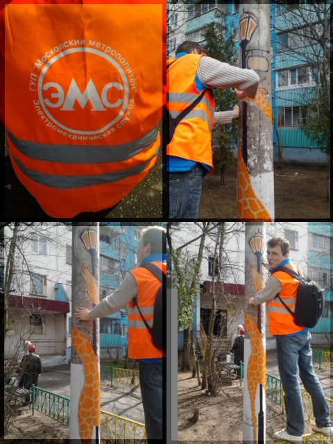 6) А вот и надпись на жилетке) Обратите внимание, как придумал художник не привлекать к себе лишнего внимания - кто ж заподозрит самоуправство, коли на жилетке написано, что работы производит служба метрополитена) И действительно - местные жители даже вслух читали надпись и не видели подвоха!)
