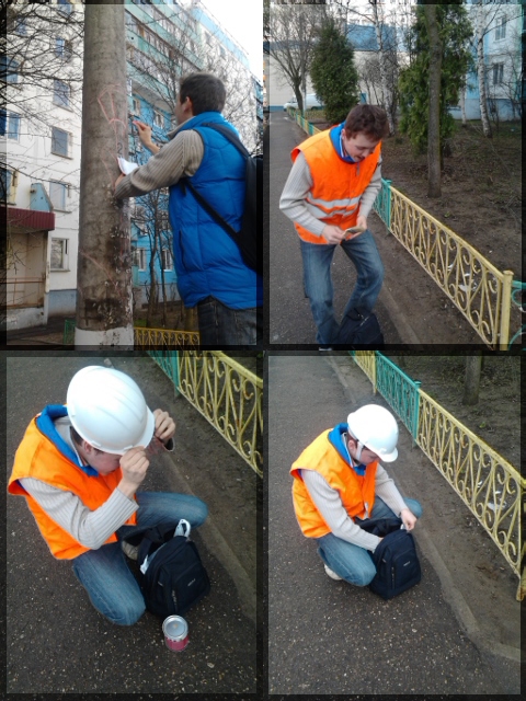 2) И вот, достал наш художник мелки, расчертил контуры будущего зверя, а затем, дабы у прохожих не возникало вопросов, нацепил на себя жилетку и каску. Впрочем, каску он вскоре снял, а какой службе принадлежала жилетка мы скоро с Вами узнаем)
