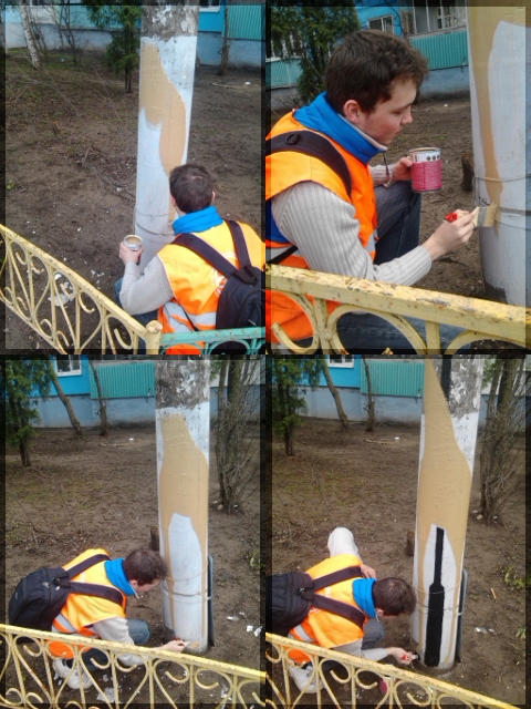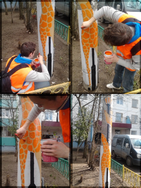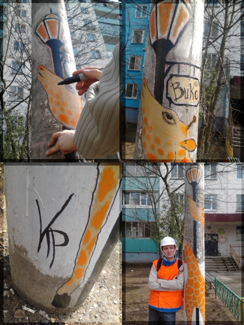 3) И принялся наш художник закрашивать по контуру будущего жирафа, попутно добавляя новые элементы и меняя пропорции. Помогал ему в этом нелёгком деле советами его напарник, местные пенсионерки и какой-то неадекватный парнишка на велосипеде)