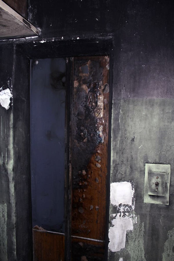 Стены и потолки подъезда оказались в черной копоти от огня и дыма, пострадали двери лифта. Кроме того, в подъезде сохраняется стойкий запах гари.