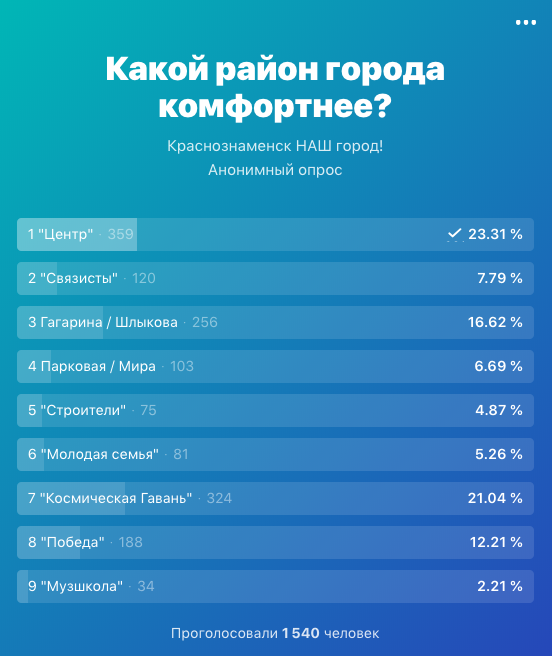 Лидирует центральная часть города, на втором месте ЖК "Космическая гавань", на третьем месте улицы Гагарина/Шлыкова, далее в порядке убывания дома вдоль улицы Победы, мкр-н Связисты, затем ул Парковая/пр-кт Мира, ЖК Молодая семья и дома рядом, ул Строителей. На последнем месте оказался мкр-н около музыкальной школы.