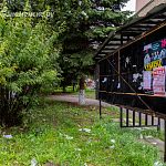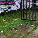 У доски объявлений на проспекте Мира творится бардак: сорванные объявления и прочий мусор валяются в траве.