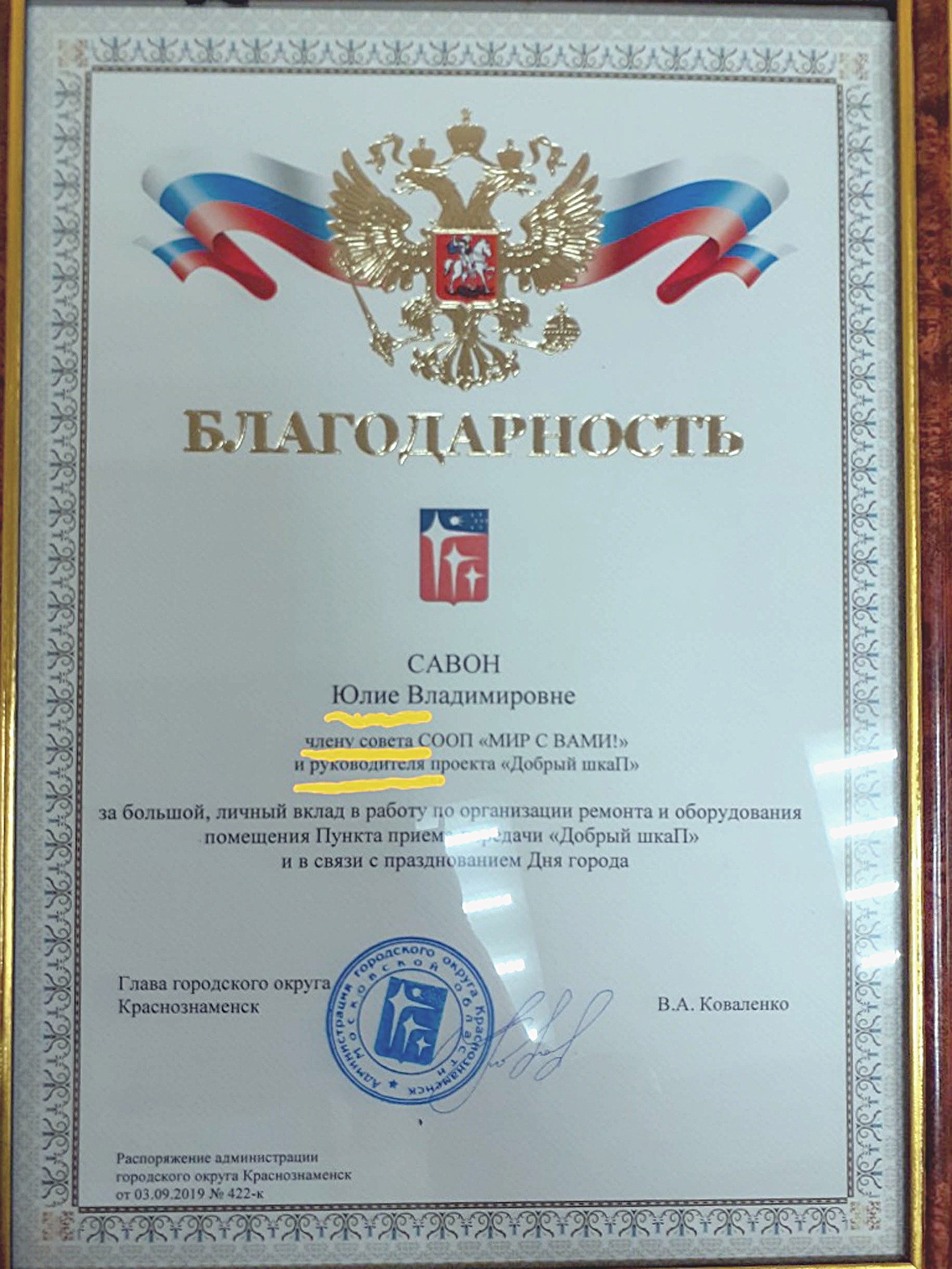 Администрация наградила благодарностью.