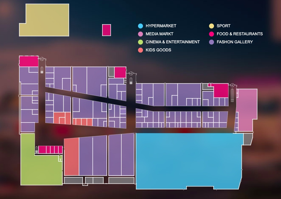 Общая площадь ТЦ 20250 кв.м, окружного типа с набором якорных крупных арендаторов