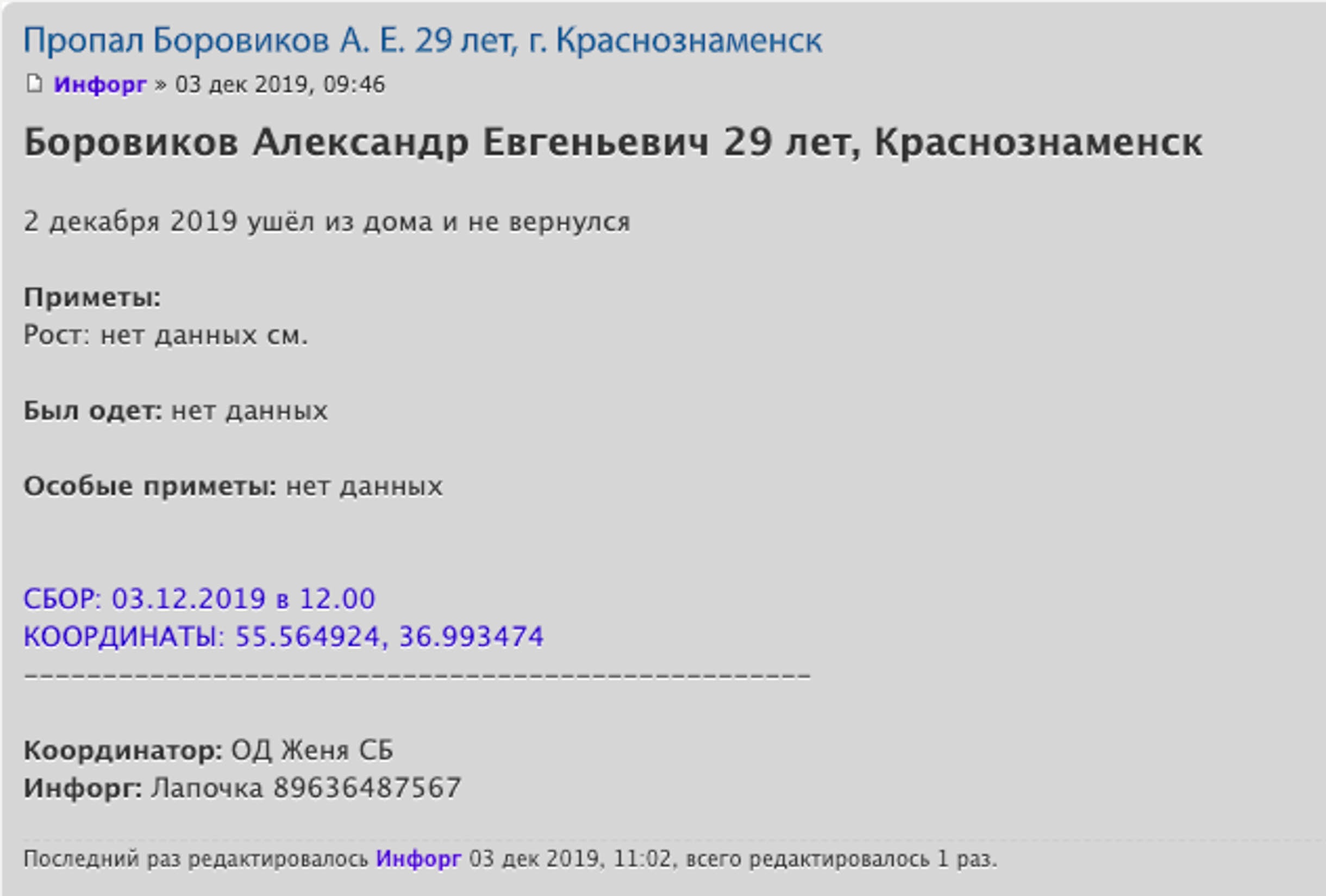 Пропал Боровиков Александр Евгеньевич 29 лет. Краснознаменск.