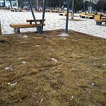 А на деле, снег с мусором как лежал, так и лежит на площади и газонах.