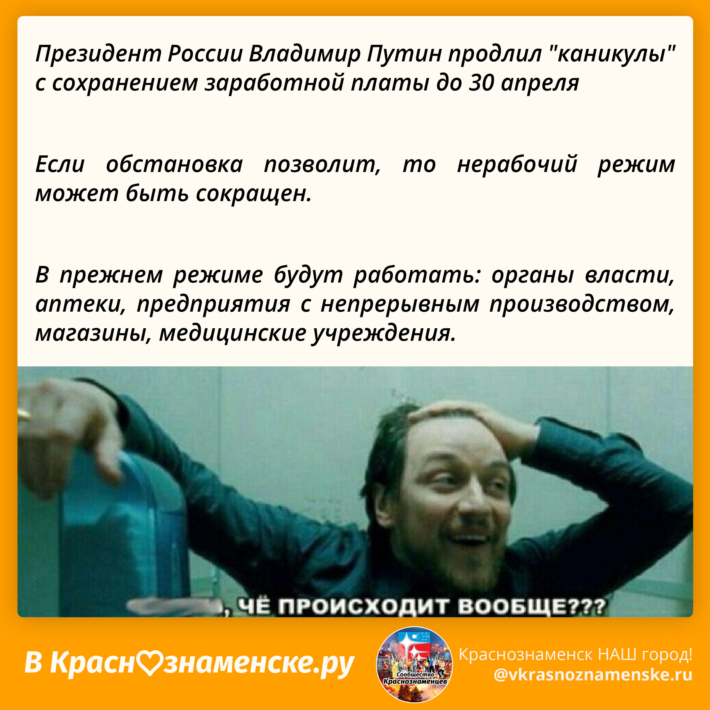 «Пик эпидемии в мире ещё не пройден, в том числе и в нашей стране», — объяснил Путин. Работу продолжат органы власти, предприятия с непрерывным производством, медучреждения и аптеки, магазины товаров первой необходимости и все службы жизнеобеспечения.