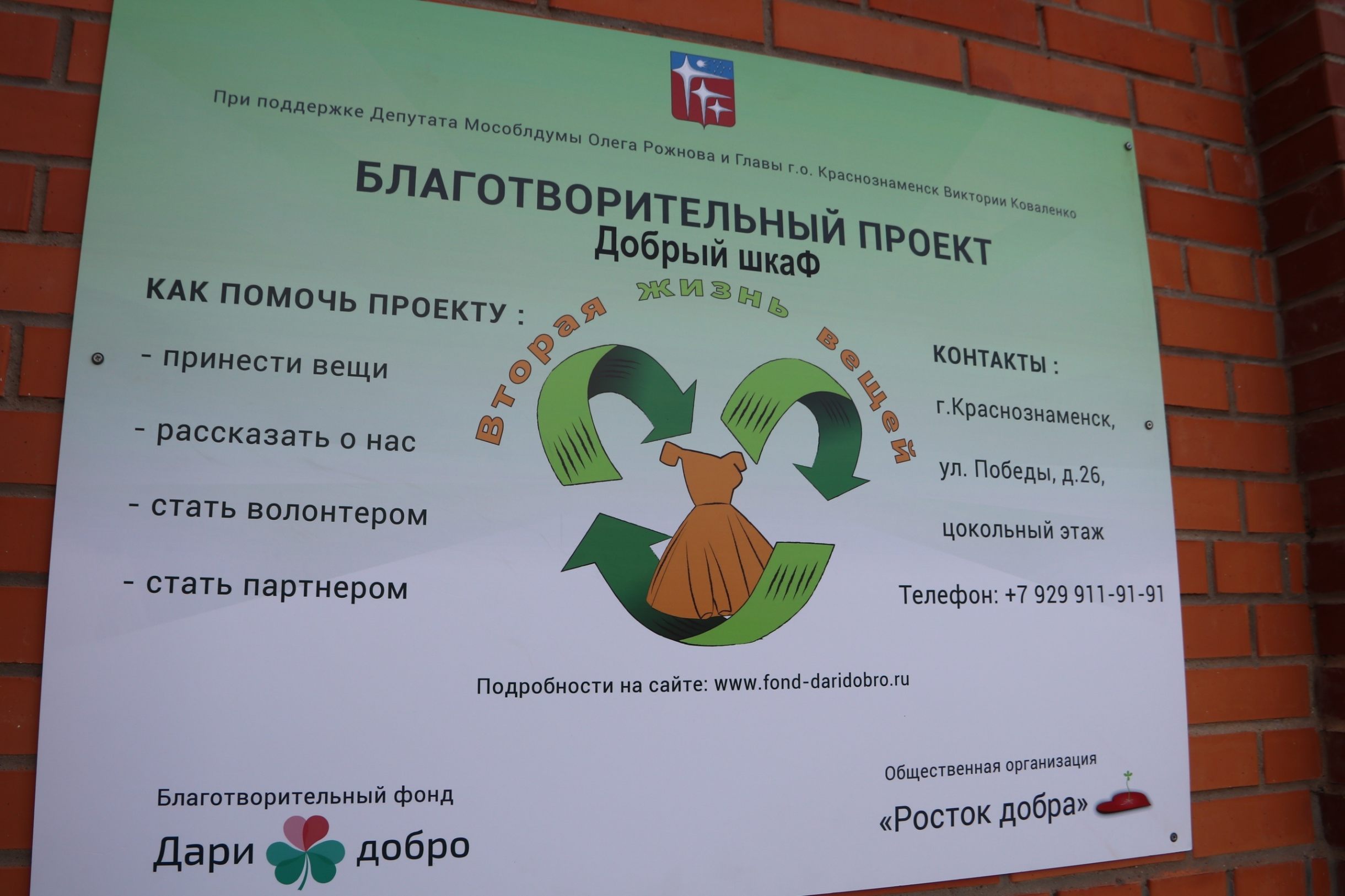 21 августа депутат Московской областной Думы Олег Рожнов, совместно с заместителем главы администрации Скрынником Виталием Анатольевичем, председателем Совета депутатов городского округа Краснознаменск Мостковым Александром Юрьевичем и депутатов Совета депутатов приняли участие в открытии благотворительного проекта «Добрый шкаФ», который получил вторую жизнь при поддержке Главы Краснознаменска Виктории Коваленко и Олега Рожнова. Проект «Добрый шкаФ» сможет помочь людям, оказавшимся в сложной жизненной ситуации и даст вторую жизнь вещам.