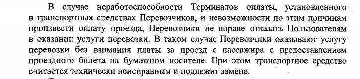 Основной пункт, регламентирующий данный порядок расположен на странице 20 в первом абзаце: "В случае неработоспособности Терминалов оплаты, установленного в транспортных средствах Перевозчиков, и невозможности по этим причинам произвести оплату проезда, Перевозчики не вправе отказать Пользователям в оказании услуги перевозки. В таком случае Перевозчики оказывают услугу перевозки без взимания платы за проезд с пассажира с предоставлением проездного билета на бумажном носителе."