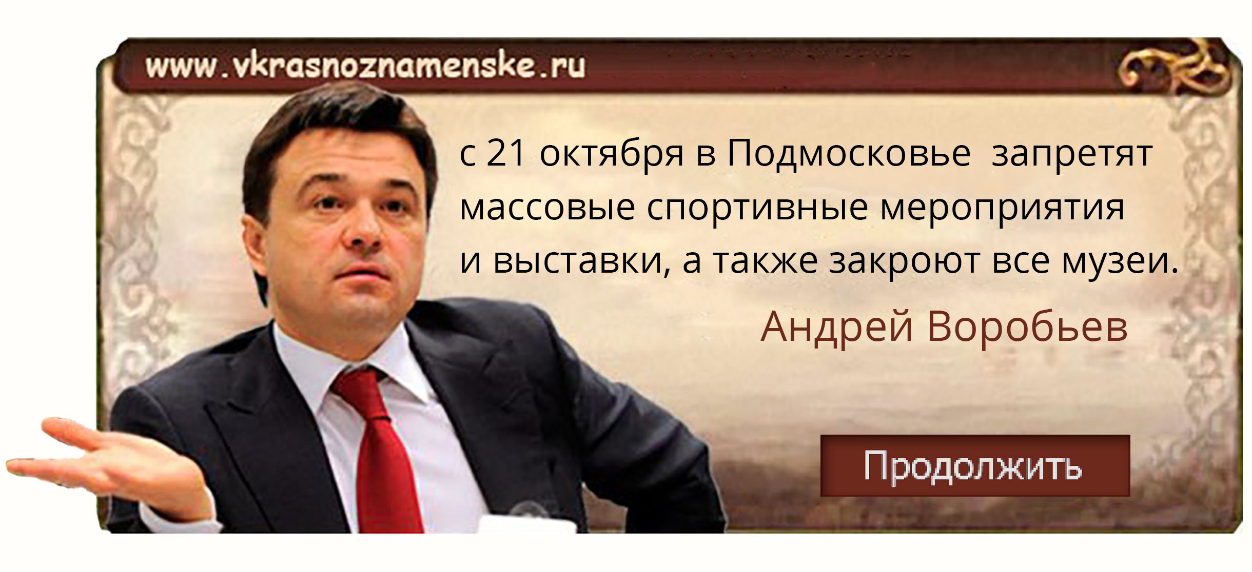 Андрей Воробьёв заявил, что из-за ситуации с коронавирусной инфекцией COVID-19 в Подмосковье с 21 октября запретят массовые спортивные мероприятия и выставки, а также закроют все музеи.