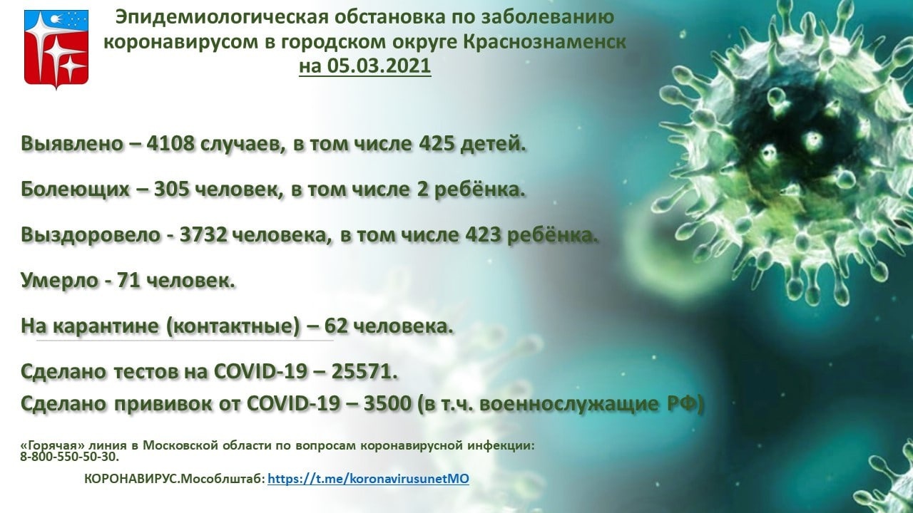 Выявлено 4108 (+21), в том числе 425 (+0) детей; болеющих 305 (-54), в том числе 2 (-2) ребёнка; выздоровело 3732 (+75), в том числе 423 (+2) ребёнка; на карантине 62 (-33), умерло 71 (+0), сделано тестов 25571 (+274), сделано прививок 3500 (+1362).
