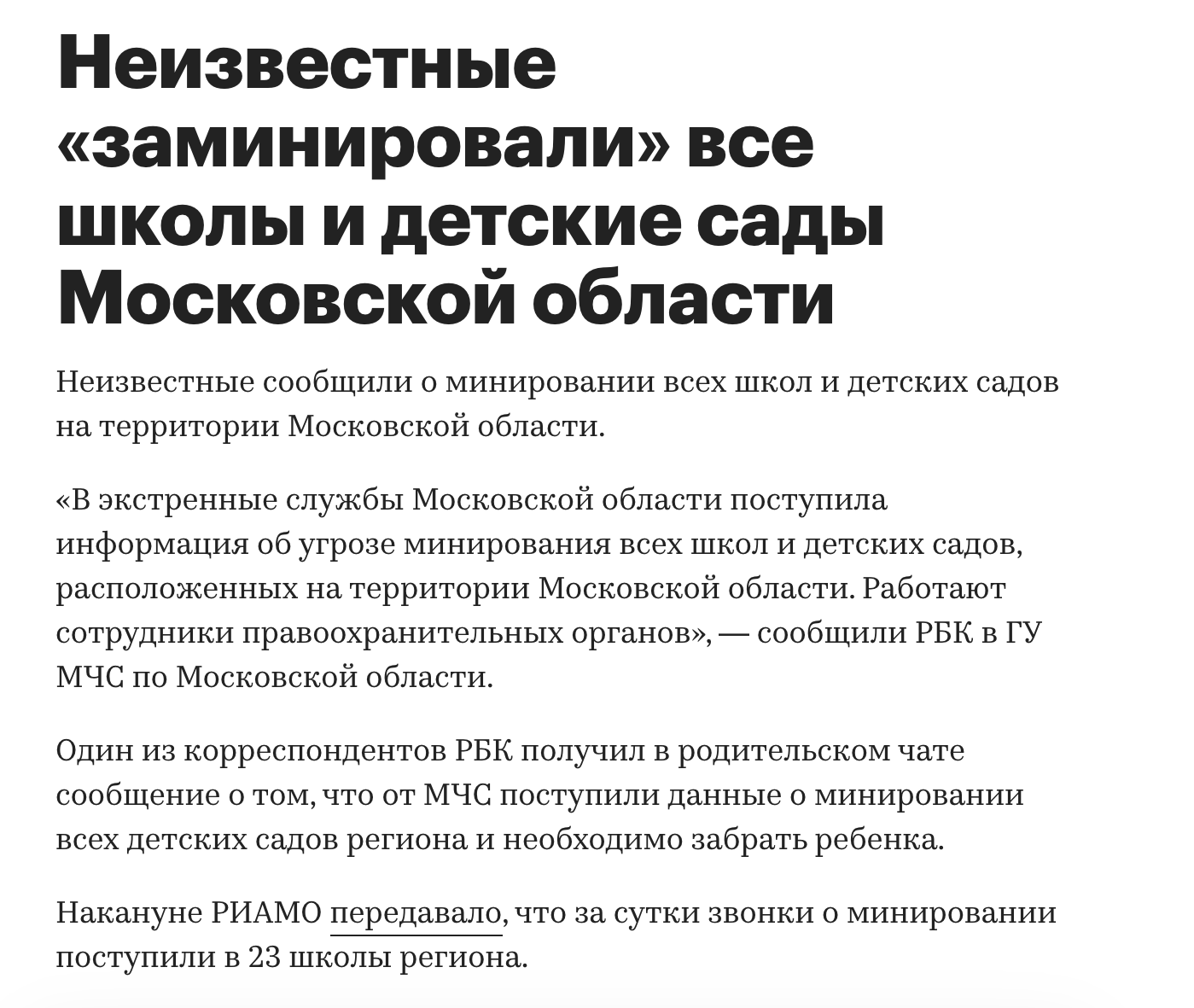 Один из корреспондентов РБК получил в родительском чате сообщение о том, что от МЧС поступили данные о минировании всех детских садов региона и необходимо забрать ребенка.