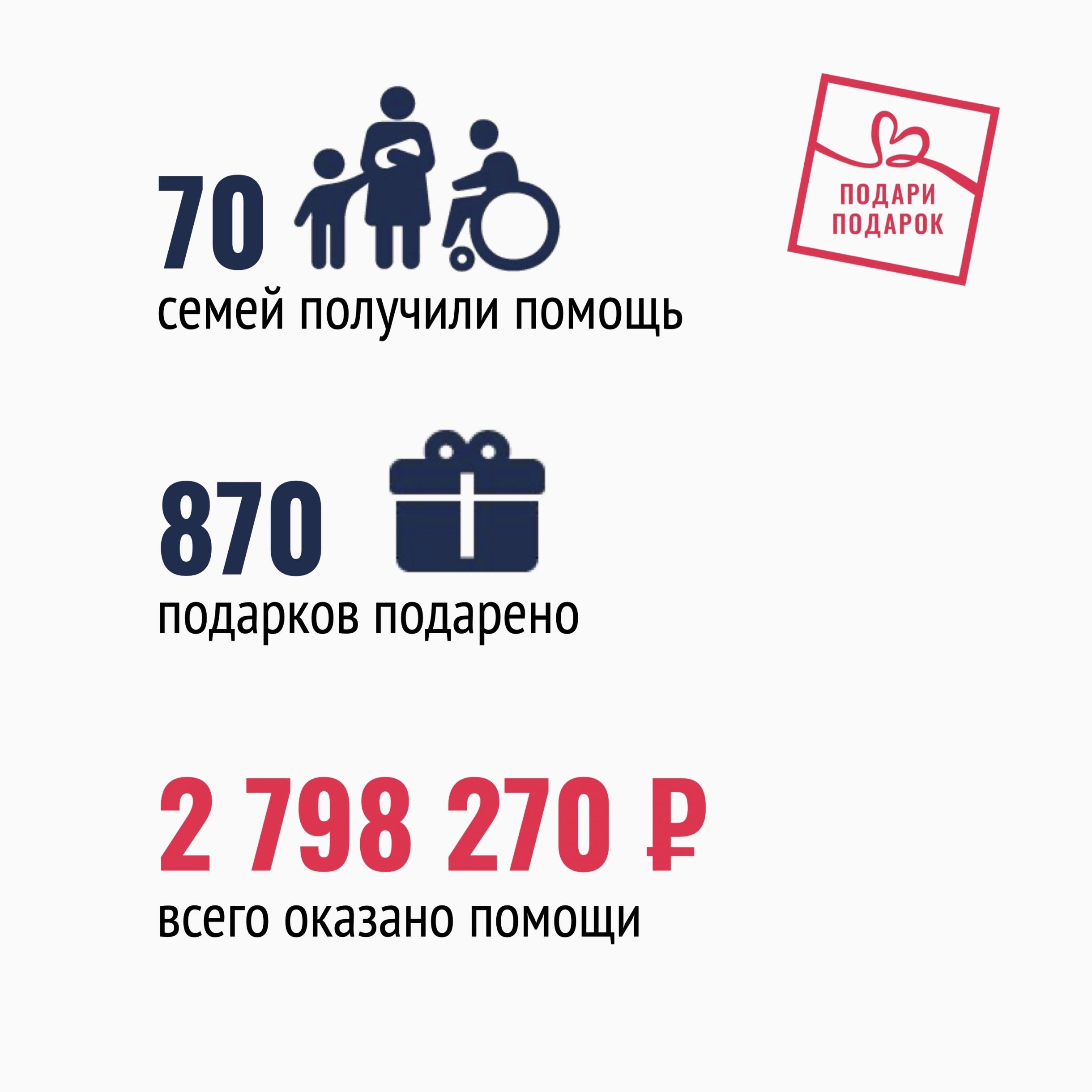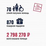 Масштаб акции охватил 19 регионов страны, 70 нуждающихся семей получили 870 необходимых подарков на сумму 2 798 270 рублей и 4 из них живут в нашем городке. Две из них многодетные, в других дети с инвалидностью и в каждой всё держится на плечах матерей одиночек. И потому, хочется выразить особую благодарность всем тем, неравнодушным людям, кто помог финансово или же приносил подарки для семей к партнёру фонда, "Бар 413".