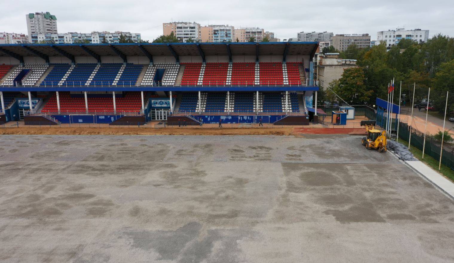 Генеральный директор «Жилкомсервис» Антон Ледовской рассказал, что ремонтные работы стартовали на стадионе в начале июля этого года. Сейчас идет уплотнение щебеночного основания и работы по монтажу коллектора подогрева футбольного поля. Ледовский отметил, что все идет по графику. Работы планируют завершить 29 сентября этого года — после поле можно будет использовать круглый год.