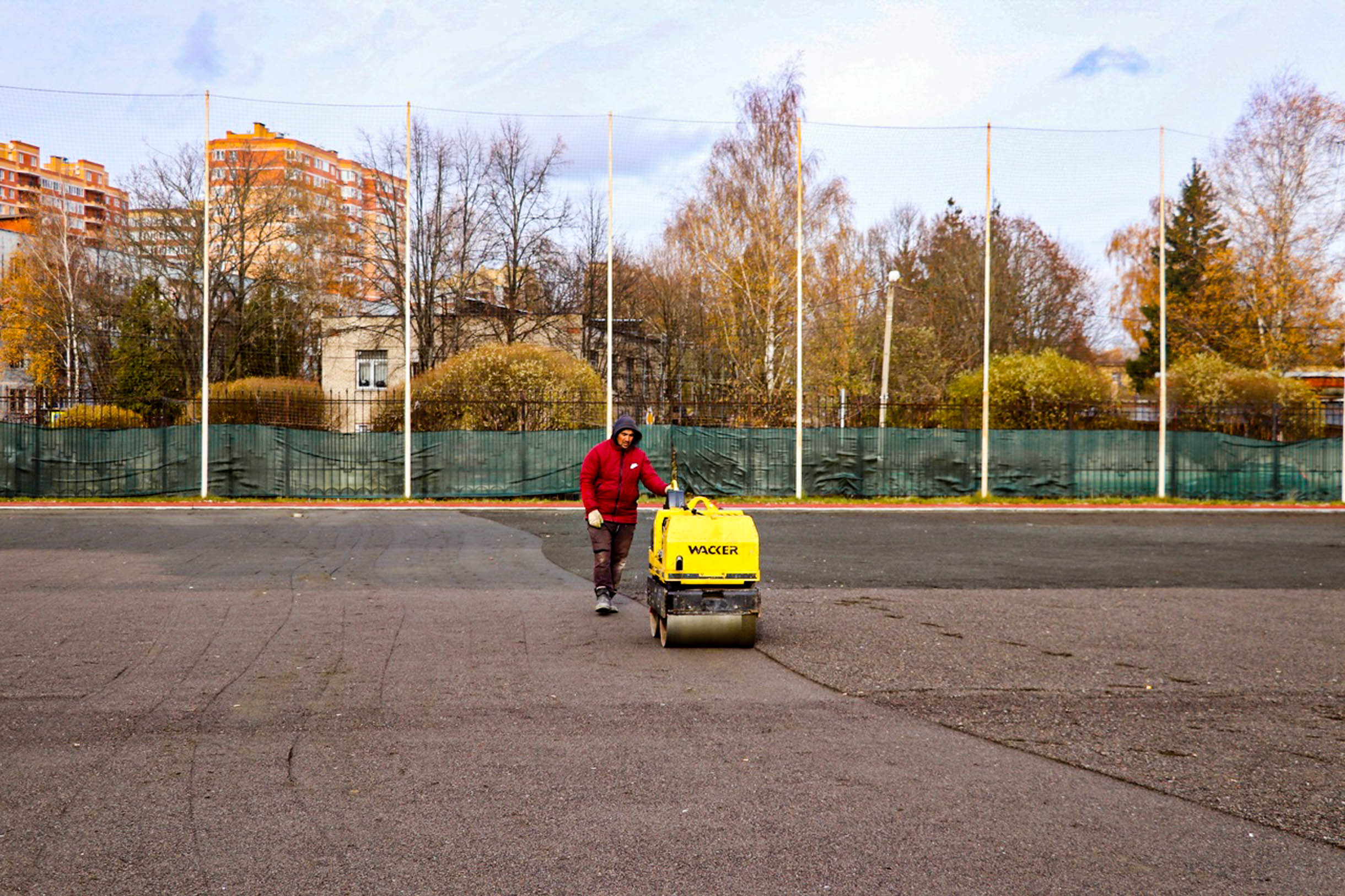 На футбольном стадионе «Заря» завершены работы по засыпке и уплотнению песком коллектора, продолжается монтаж оборудования в индивидуальном тепловом пункте, закончены работы по отсыпке основания из гранитного отсева, уплотнение и выравнивание основания под беговую дорожку.
