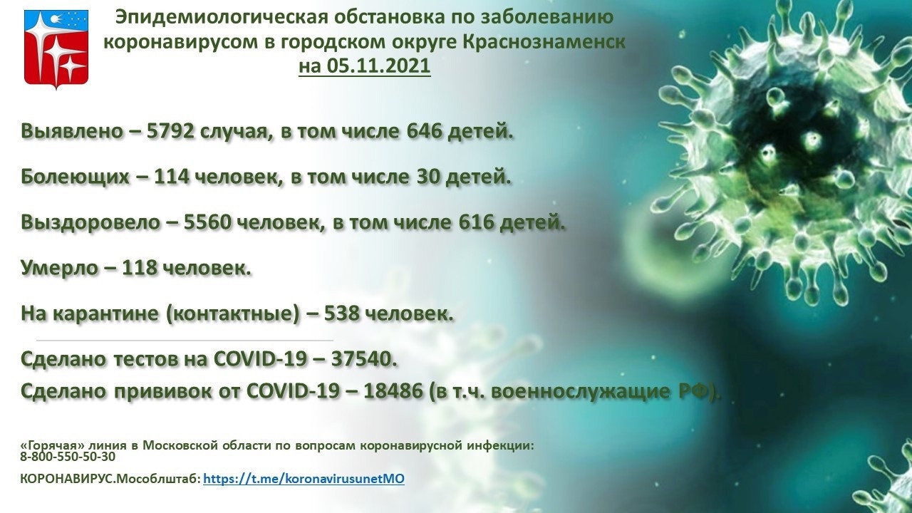 Выявлено 5792 (+16), в том числе 646 (+10) детей; болеющих 114 (-2), в том числе 30 (-8) детей, выздоровело 5560 (+9), в том числе 616 (+18) детей, на карантине 538 (-31), умерло 118 (+9), сделано тестов 37540 (+296), сделано прививок 18486 (+76).