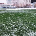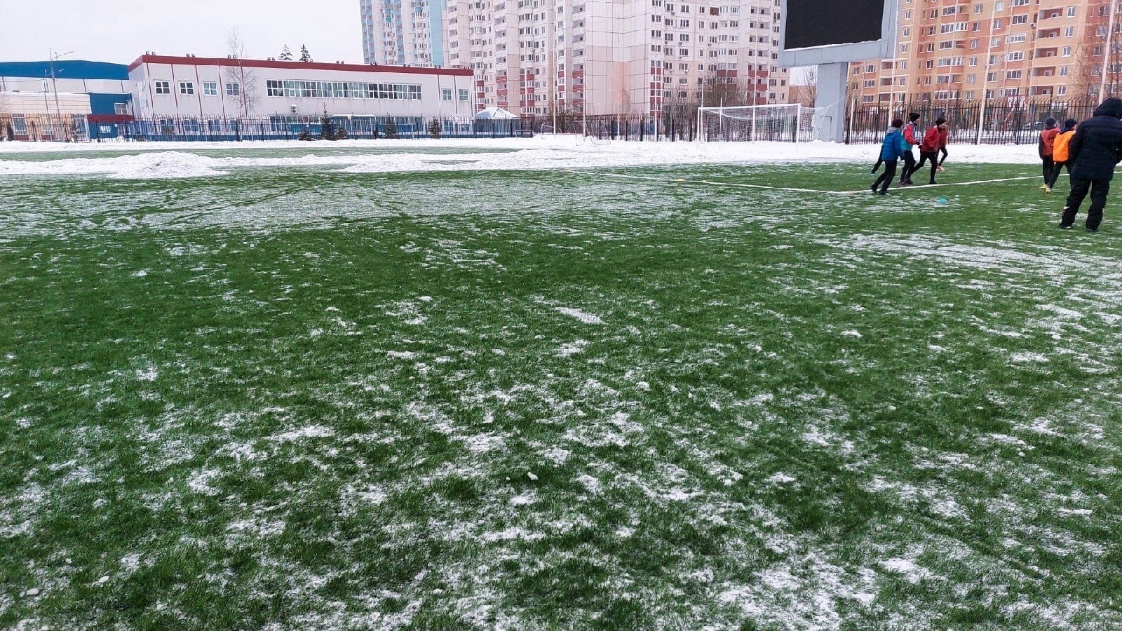 Поле было по колено в снегу. Снег убирали до пятницы, в пятницу же включили подогрев. Но пока он разгонялся( в минус разогреть систему, требуется гораздо больше времени) начался новый снегопад). К субботним играм на поле лежал 10 сантиметровый слой снега. А снизу корка льда. Было принято решение играть, чтобы прибить снег к полю и он быстрее растопился. Снег в итоге скатался в комья льда. Где играли снега нет сейчас а места где не бегали снег лежит