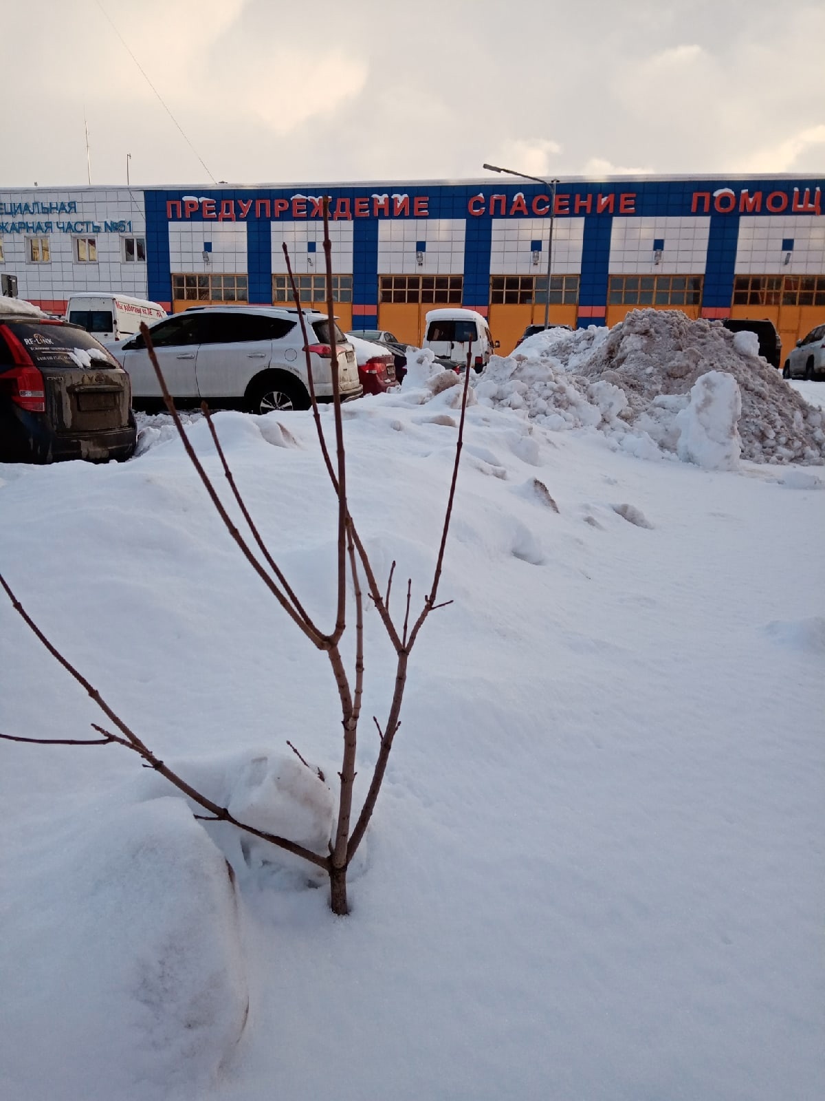 Администрация, которая каждый год выделяет деньги на деревья их же и ломают сотрудники МБУ "КХБ" зимой. Сегодня производилась уборка парковки от снега. Снег складывали на газон, где высажены деревья и ещё проехались по ним трактором.